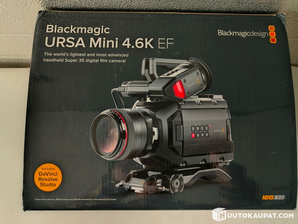 Alkuperäinen myyntilaatikko (URSA Mini 4.6K EF, “Includes DaVinci Resolve Studio”, 12G-SDI -merkinnät)