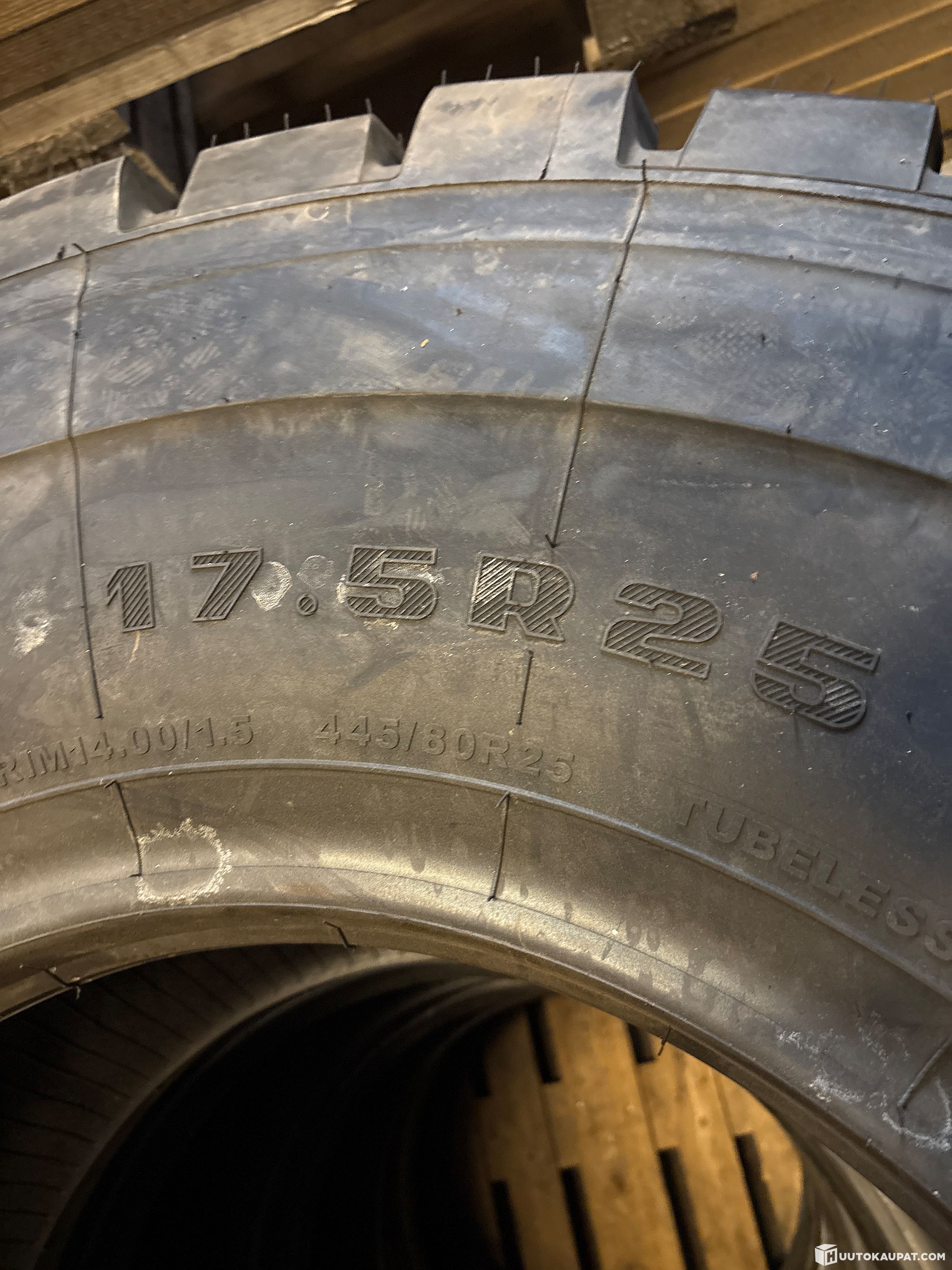 4 kappaletta uusia 17,5R25 Aeolus A Snow pyöräkuormaajan renkaita. Renkaat on käyttämättömät, mutta paistettu vuonna 2016. Olleet varastossa vuosia. Renkaat on tarkoitettu asennettavaksi lukkovanteelle, niissä on leveä jalkaosa.