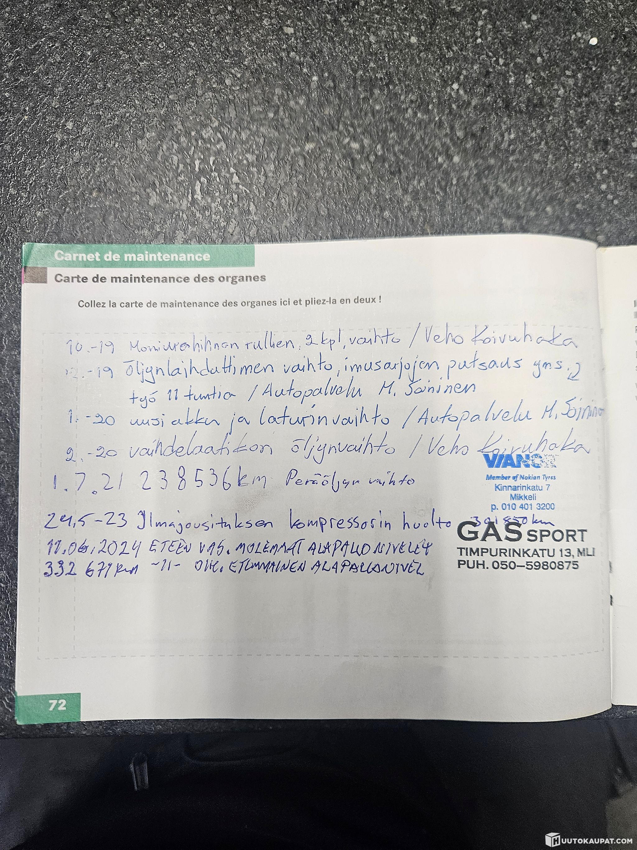 Liitteenä kuvia huoltokirjasta.