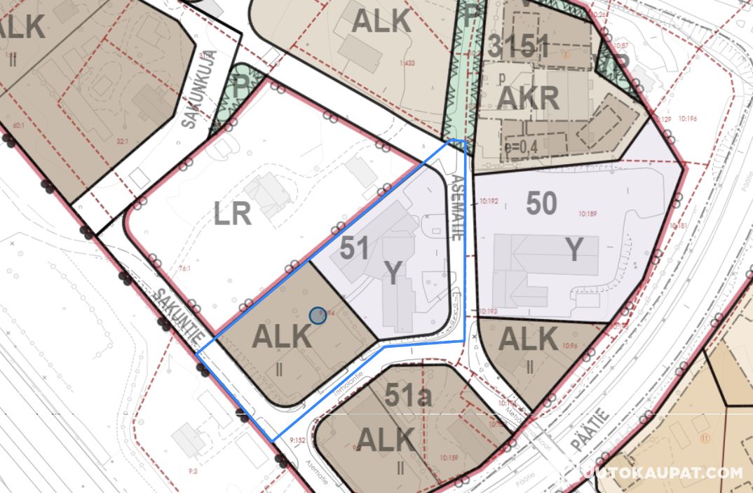 ALK (yhdistettyjen liike- ja asuntokerrostalojen korttelialue) 2030 m2, rakennusoikeus 30% rakennuspaikan pinta-alasta 609 k-m2