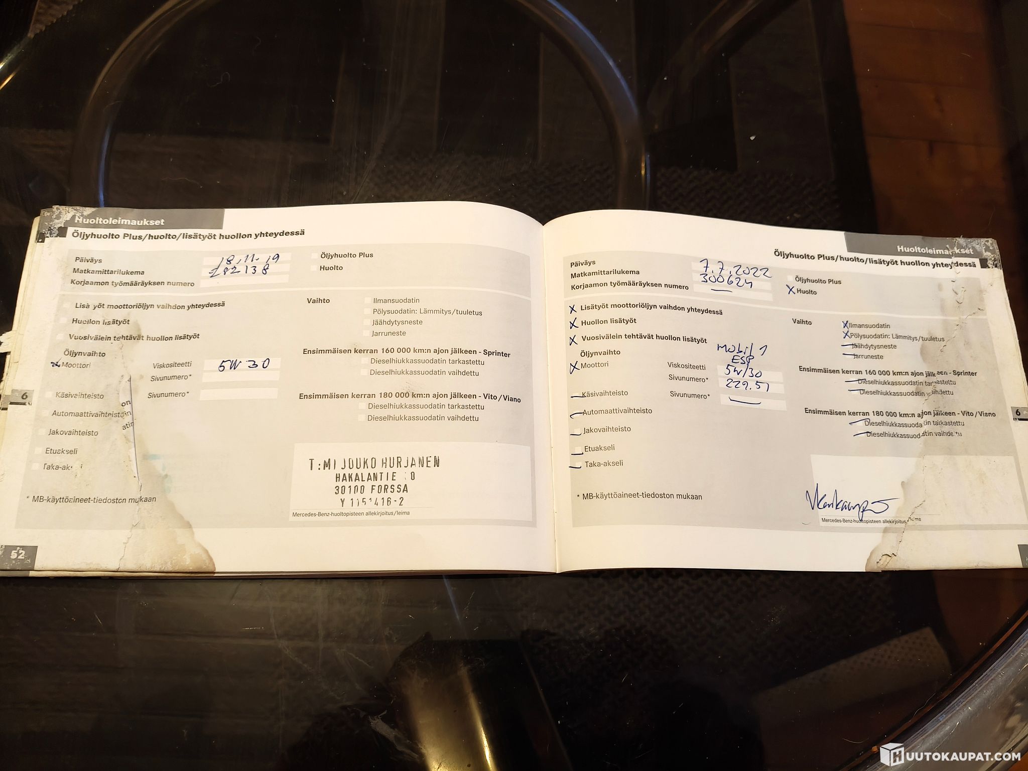 Edellisten omistajien tietojen mukaan vaihdettu hiljattain turboahdin, etu-umpiot, hehkuja ja akku. Näistä ei dokumentteja tallella, joten tietojen oikeellisuutta en pysty varmistamaan. Päällisin puolin näyttävät vaihdetuilta. Huoltokirja kärsinyt.