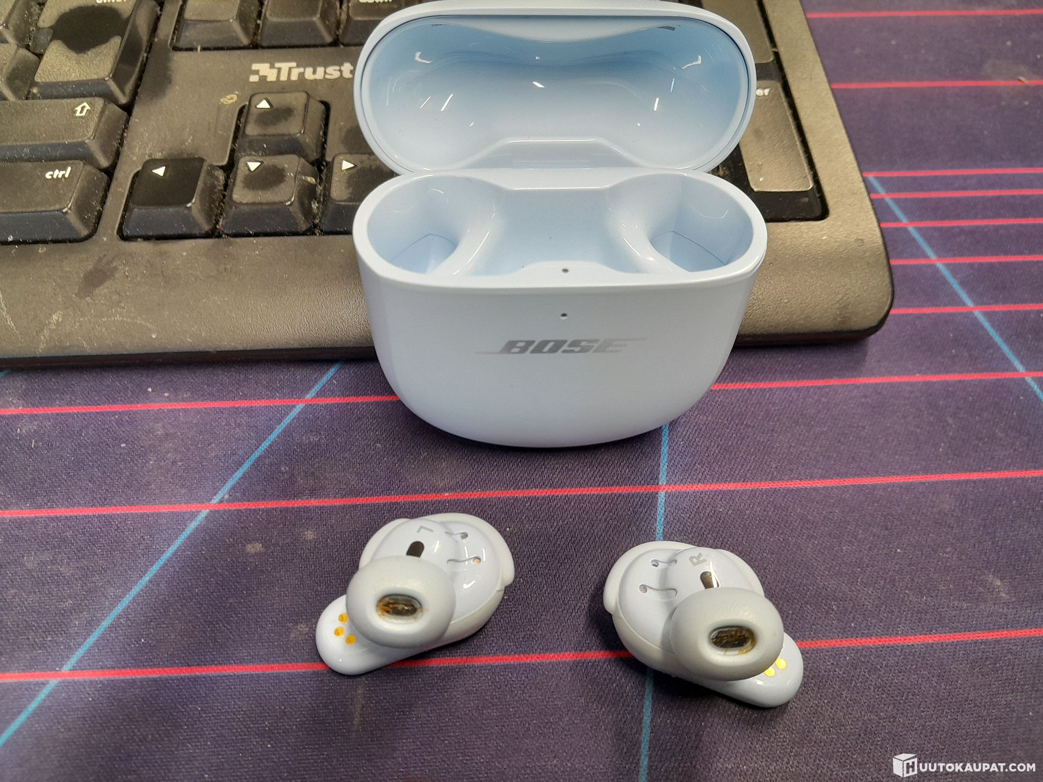 Käytetyt, mukana napit, latauskotelo ja laturi.
