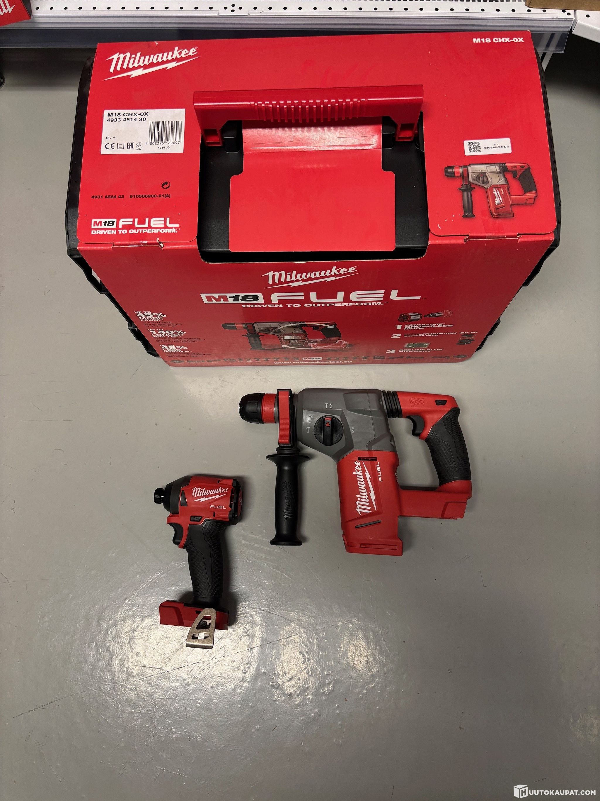 Käyttämättömät Milwaukee akkukoneiden runkoversiot. 2kpl poravasara M18 CHX-0X sekä 1kpl iskevä ruuvinväännin M18 FID2.