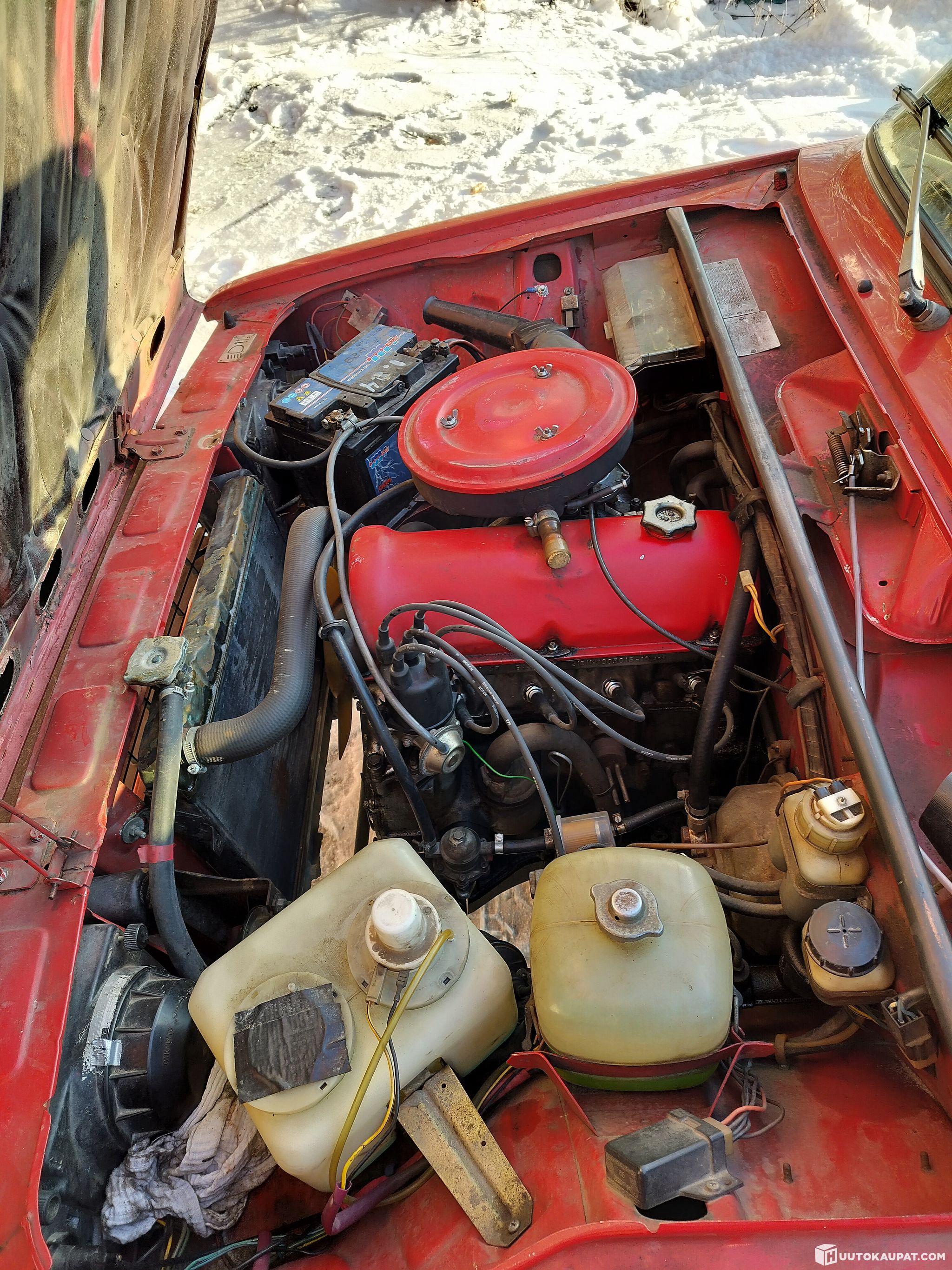 Hyvis säädöis pelaa kuin kuuluukin. Perä ja laatikko ei äännä. Alkuperäinen sisältä siisti ja ehjä vaalea sisusta, ei ole räpelletty mitään. Konepellissa merkki on tarraa eli saa pois, jos haluaa. Tosiaan uudet talvirenkaat alle laitettu tälle talvelle, siisteillä alumiineilla. Pakoputki uusi, edestä taakse asti huollettu paljon, pellit ovat suorat.