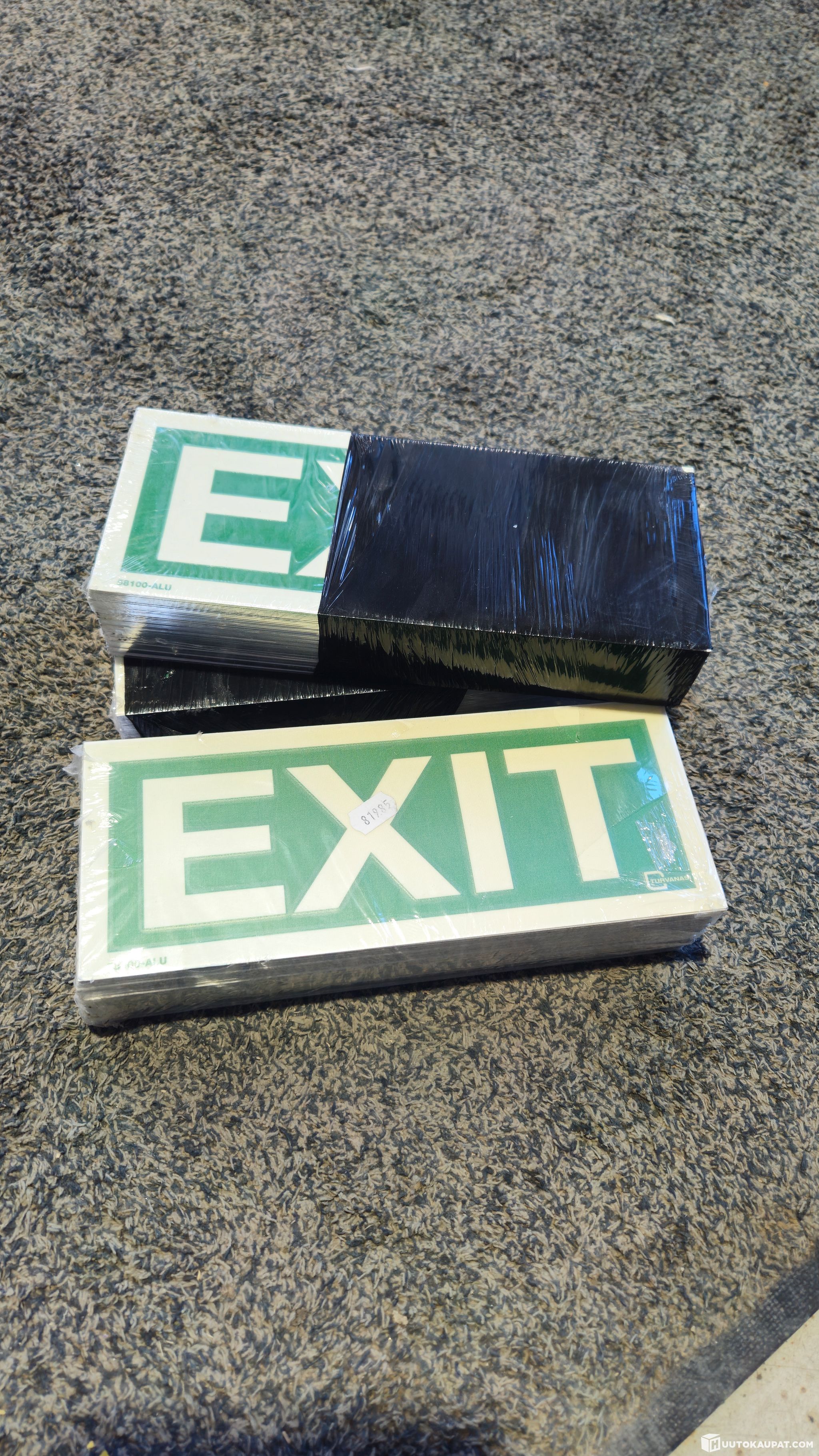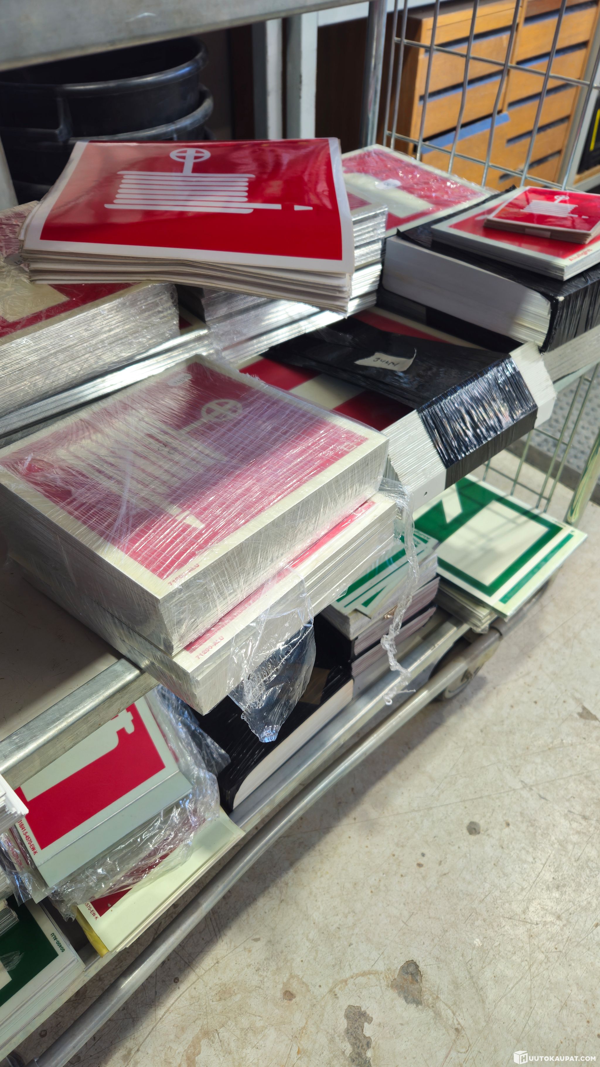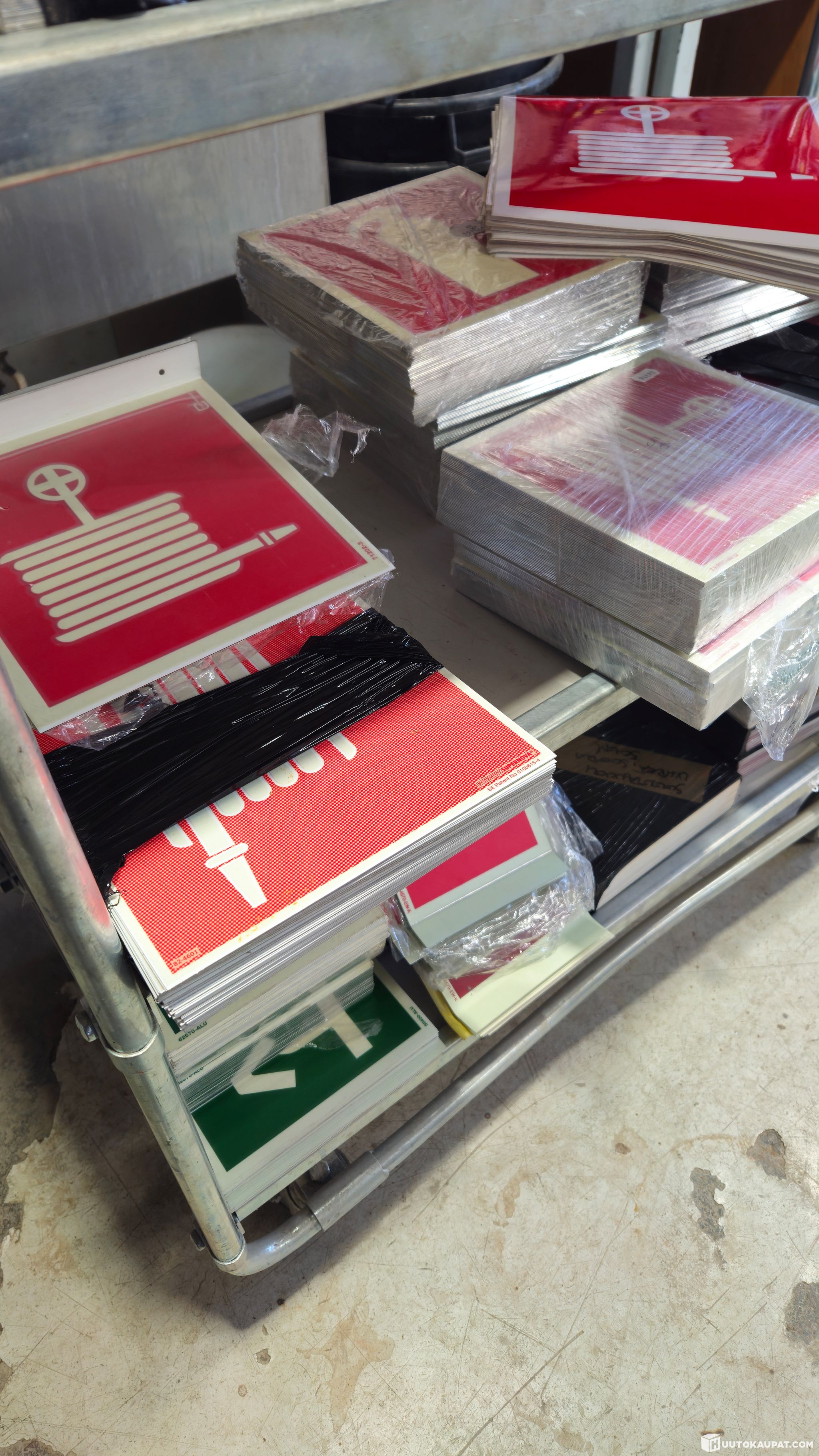 Iso kasa palontorjuntaopasteita. Sammutin, paloposti, poistumistie ym. Alumiini ja muovikilpiä. Suuri osa jälkivalaisevia (valitettavasti listaan ei ole yksilöity)