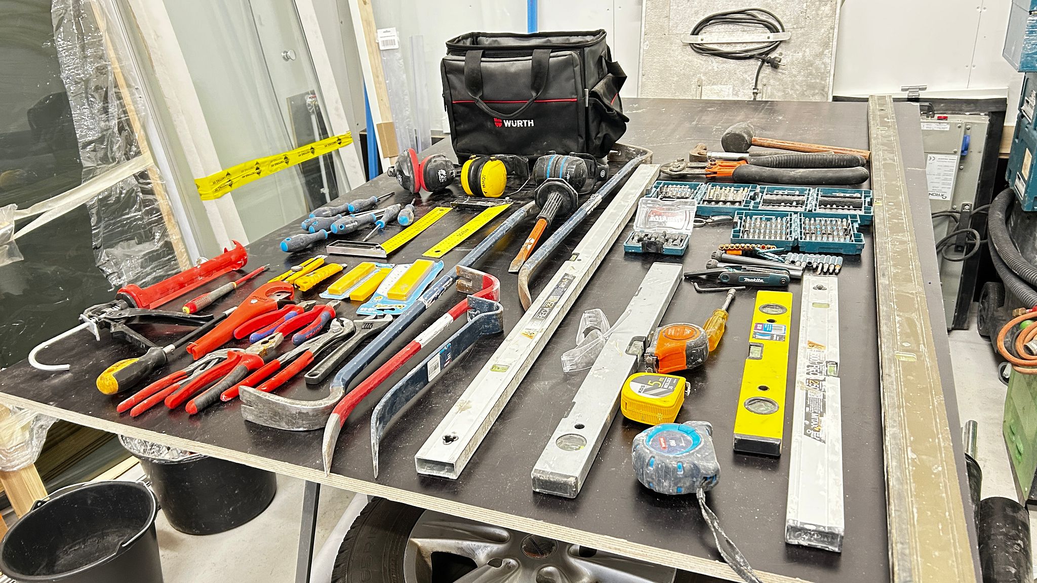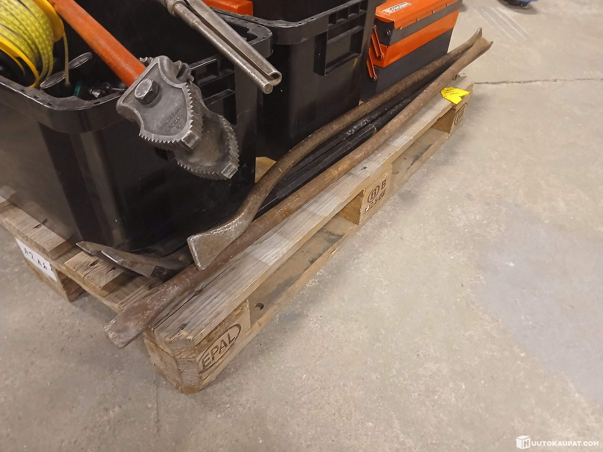 Kuvien mukainen erä käsityökaluja: lenkkiavaimia, vääntovarsia/sorkkarautoja, työkalusettejä, poranteriä, työkalupakki(tyhjä), yms.