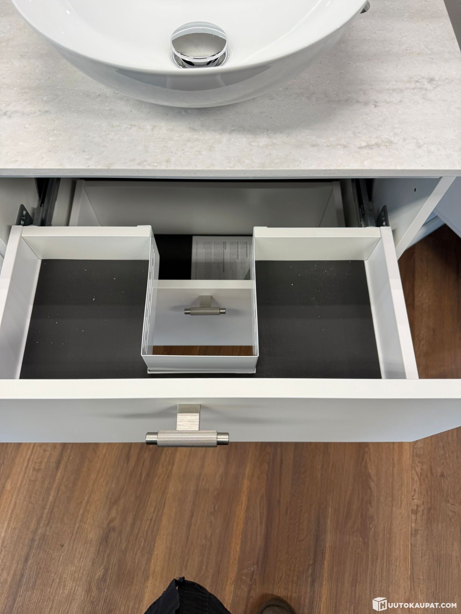 Kalusteiden väri on tyylikäs mattavalkoinen ja tasomateriaalina on kestävä sekä helppohoitoinen Hi-Macs. Kokonaisuus on suunniteltu erityisesti pieneen tilaan – kompakti, toimiva ja näyttävä ratkaisu, joka yhdistää modernin muotoilun ja käytännöllisyyden.