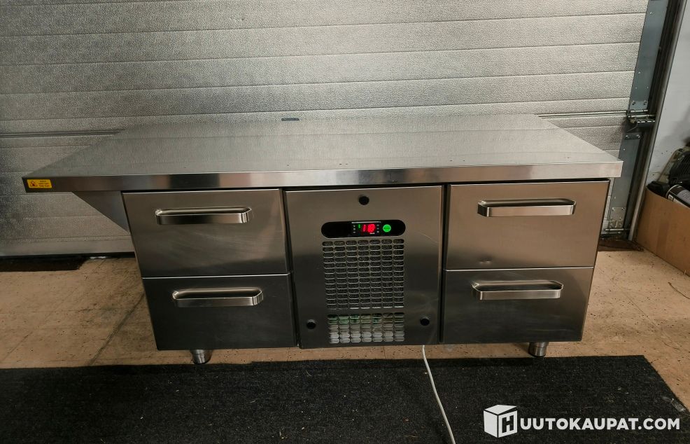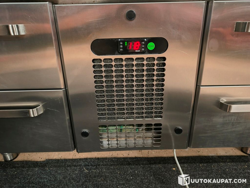 Ruostumattomasta teräksestä valmistettu ravintolakäyttöön tarkoitettu kylmävetolaatikosto työ-/laitetasolla. 4 Vetolaatikkoa (2+2), keskellä irrotettava kylmäkoneikko/ilmanvaihtoritilä sekä Dixell-digitaaliohjain ja lämpötilanäyttö. Mukana verkkovirtajohto.