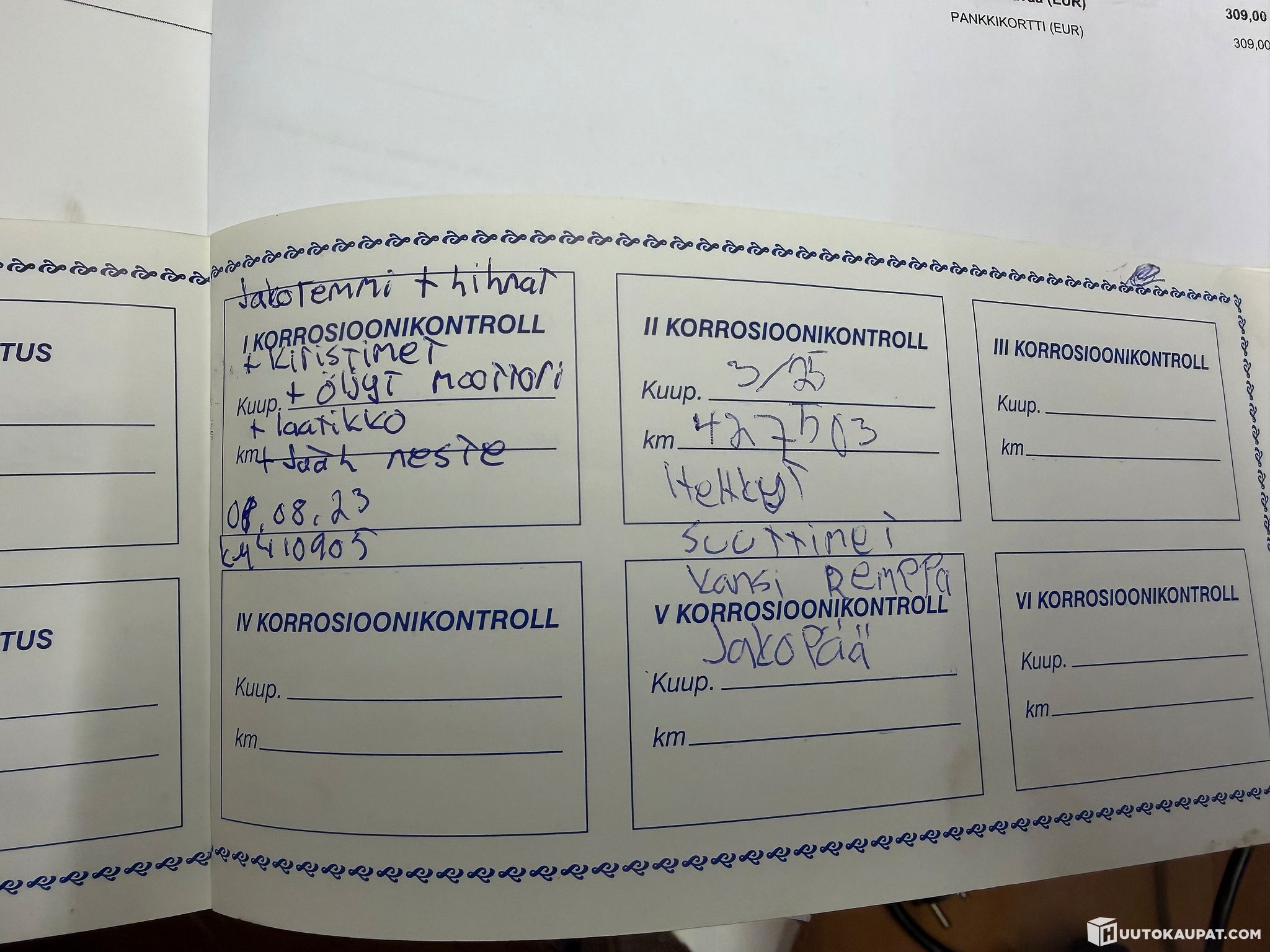Huoltokirja ja kuitteja huolloista, katso kuvat.