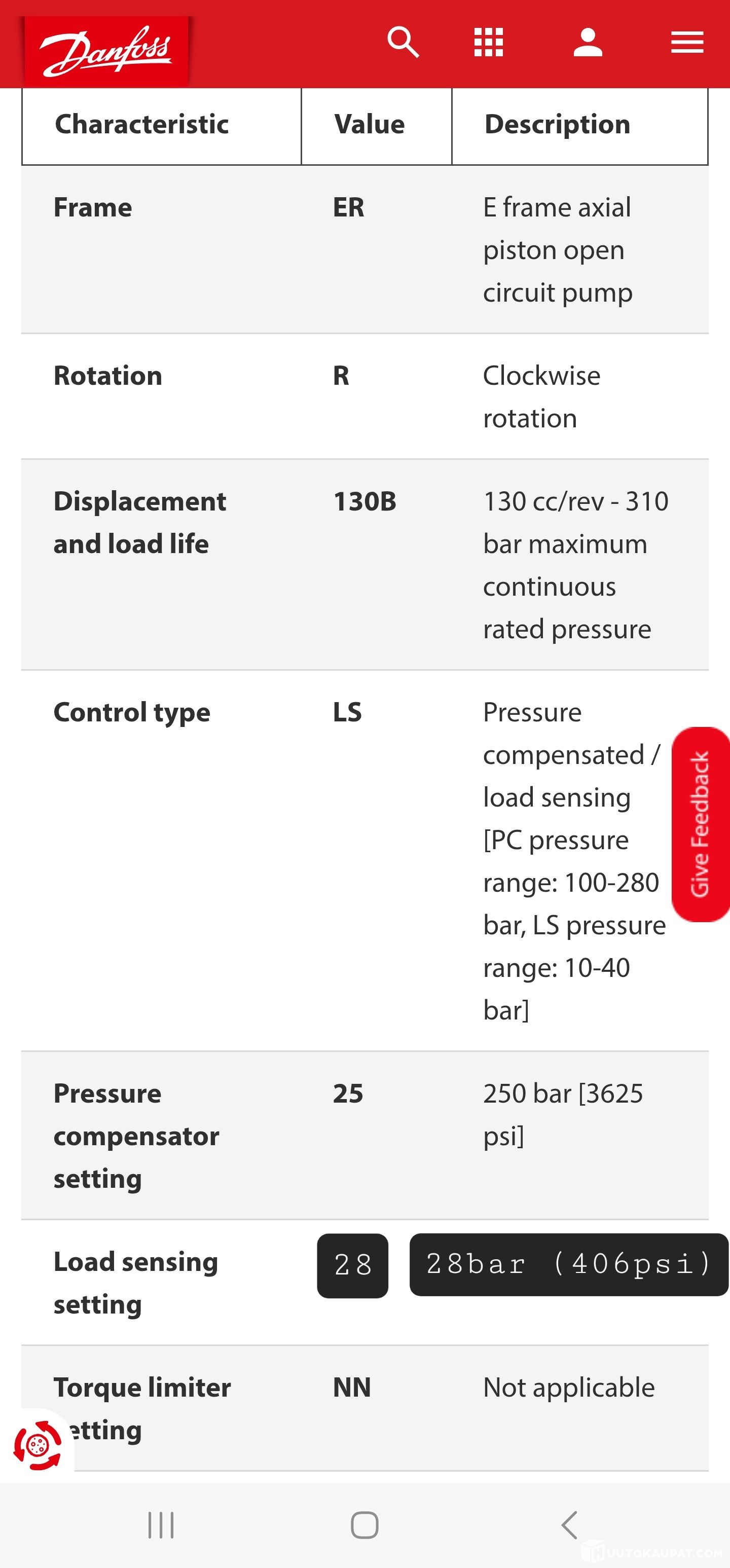 Danfoss ER-R-130B-LS-25-28-NN hydraulipumppu on Danfoss Series 45 -sarjan 130 cm³ (130B) avoimen piirin aksiaalimäntäpumppu (ERR), LS-ohjauksella, 250/28 bar asetuksilla. Se on korkeapaineinen säätyvätilavuuksinen pumppu (max. 310 bar).