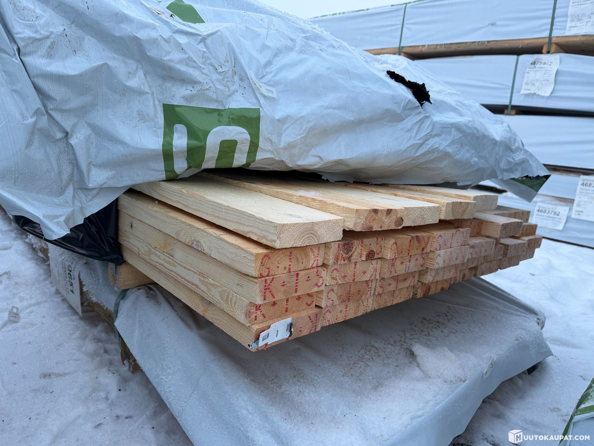 Monikäyttöistä sahatavaraa tehtaan paketissa.