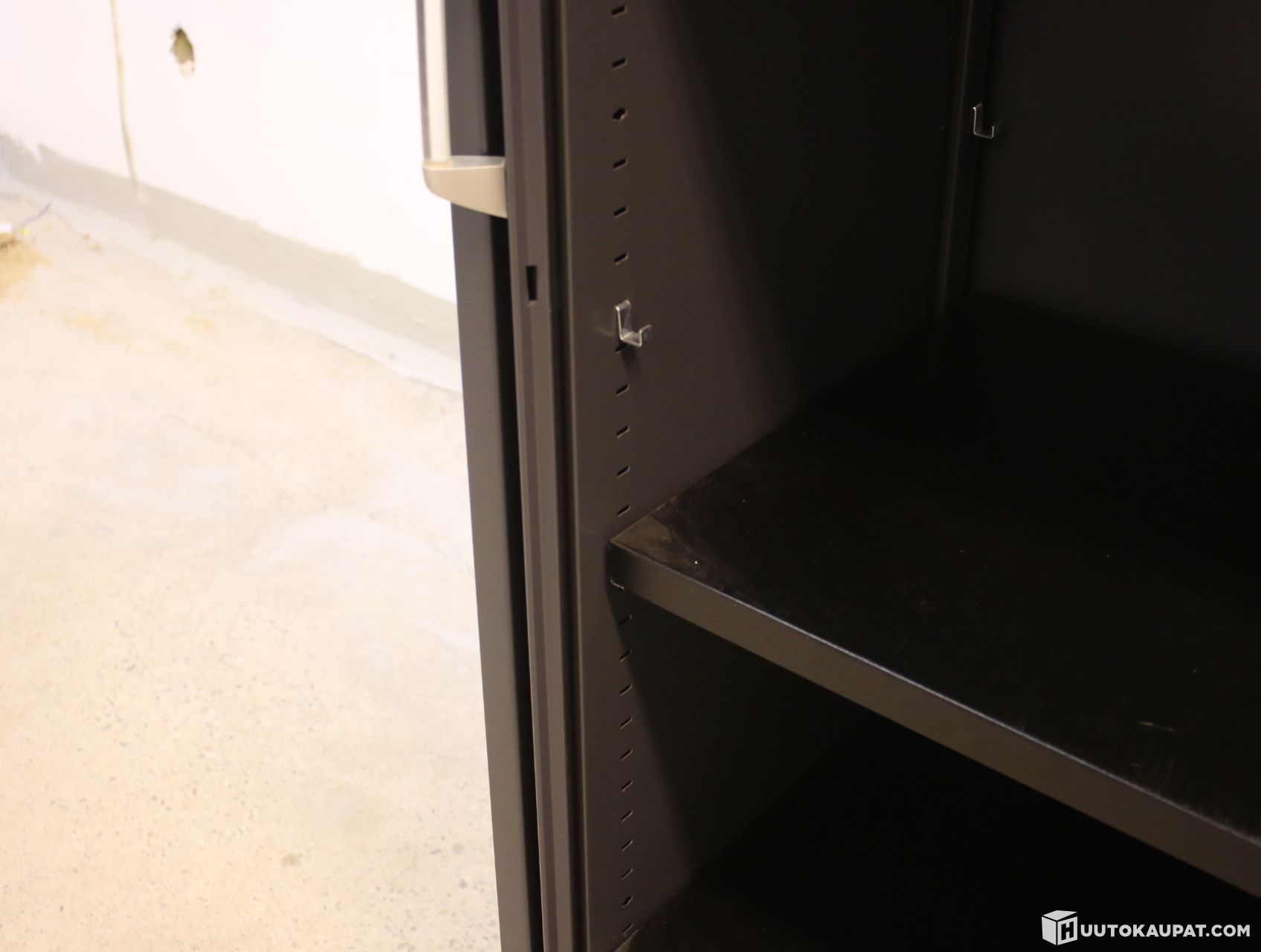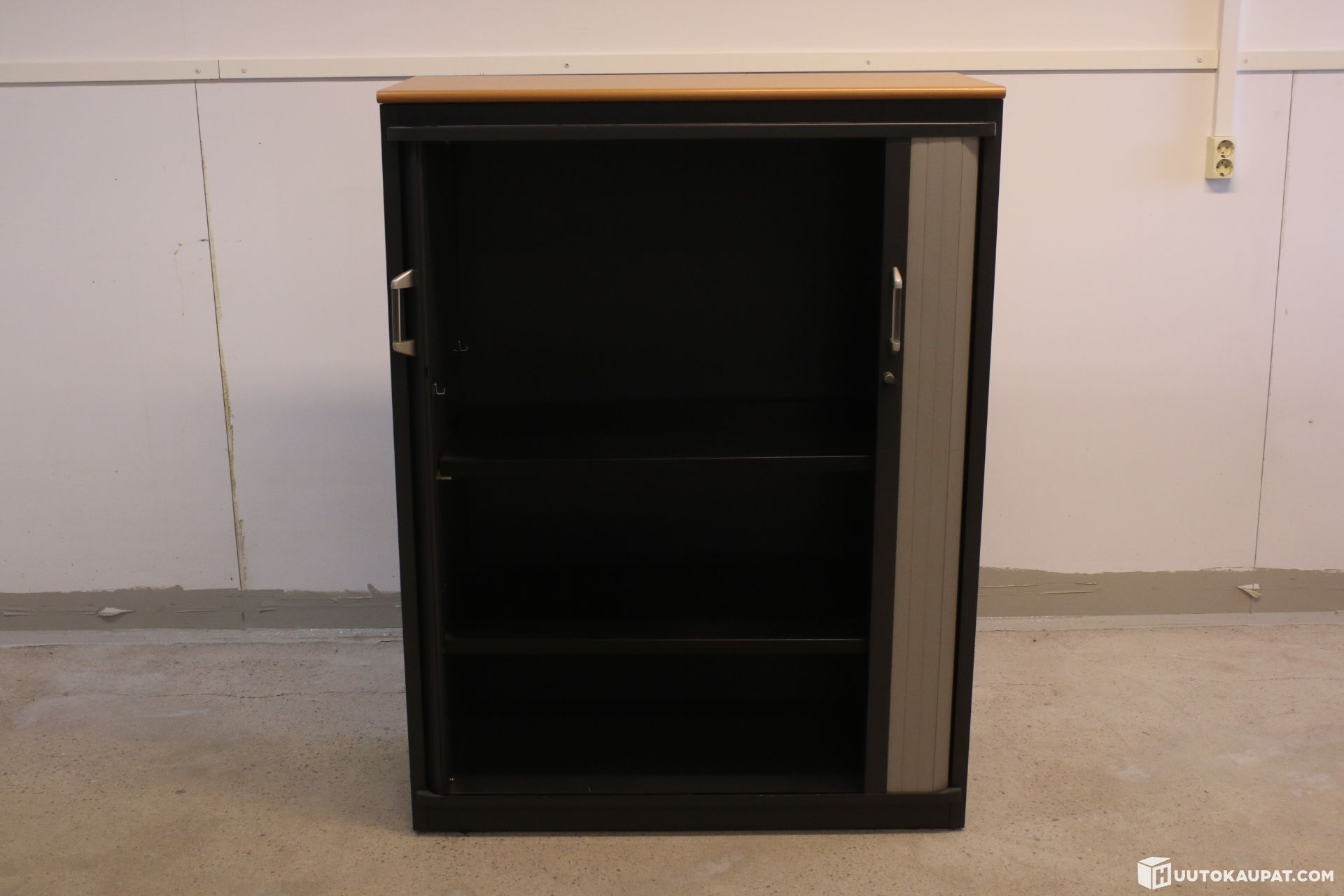 Tukeva Steelcase-sivurulokaappi metallisilla hyllytasoilla. Kaapin sivut ovat metallia ja katto puuta.