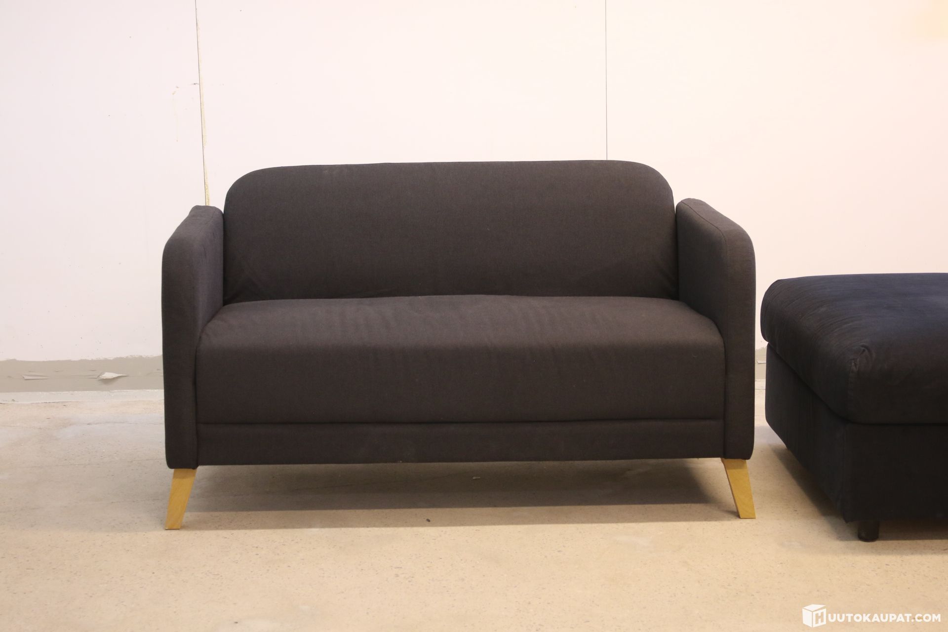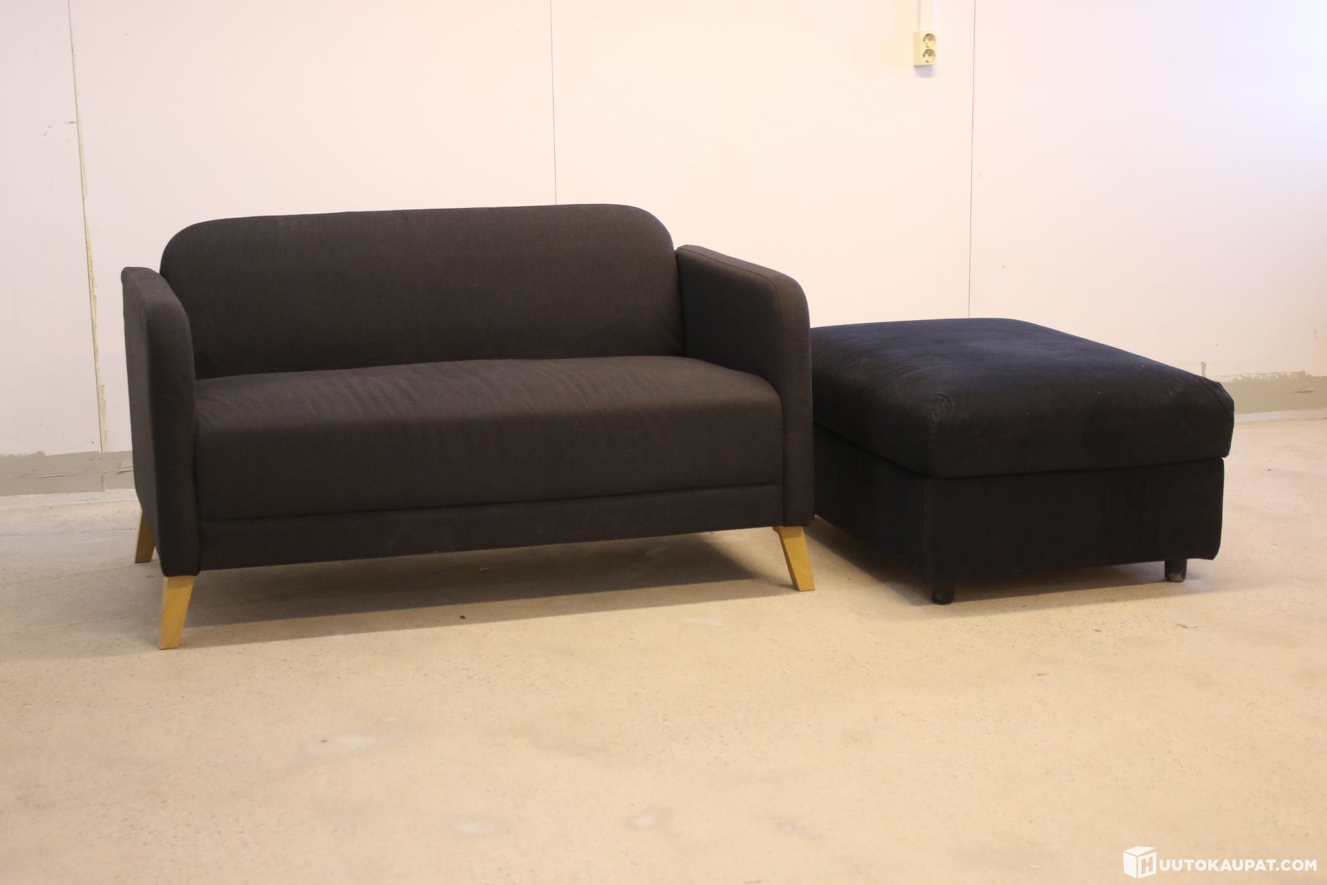 Ikean kahden istuttava Vimle-sohva sekä rahi. Kannellinen rahi, jossa säilytystila sisällä.