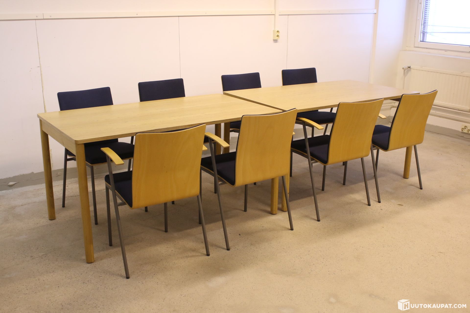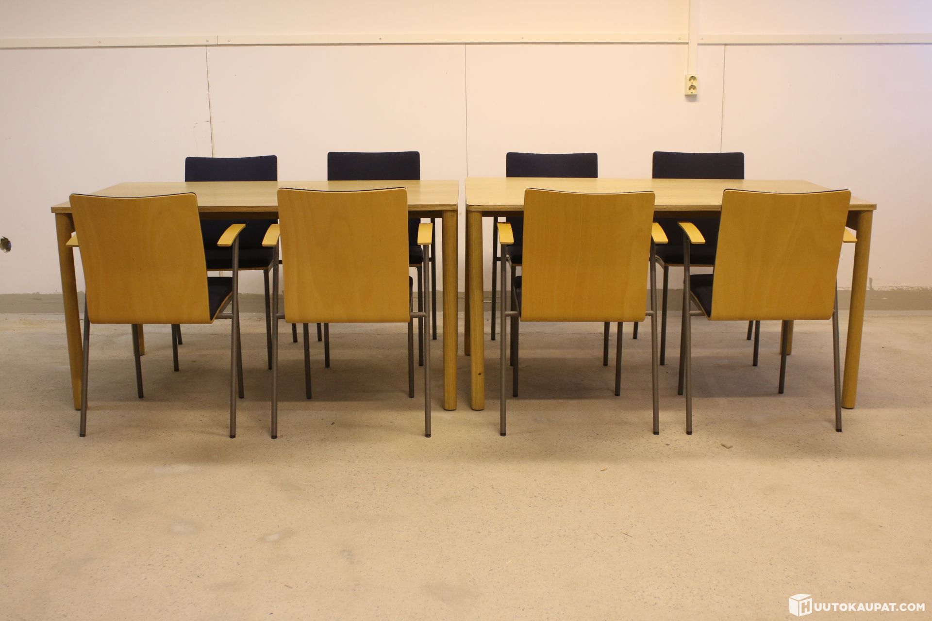Siisti setti kahdeksalla Martela Picco-tuolilla ja kahdella pöydällä. Tuolit ovat pinottavia.