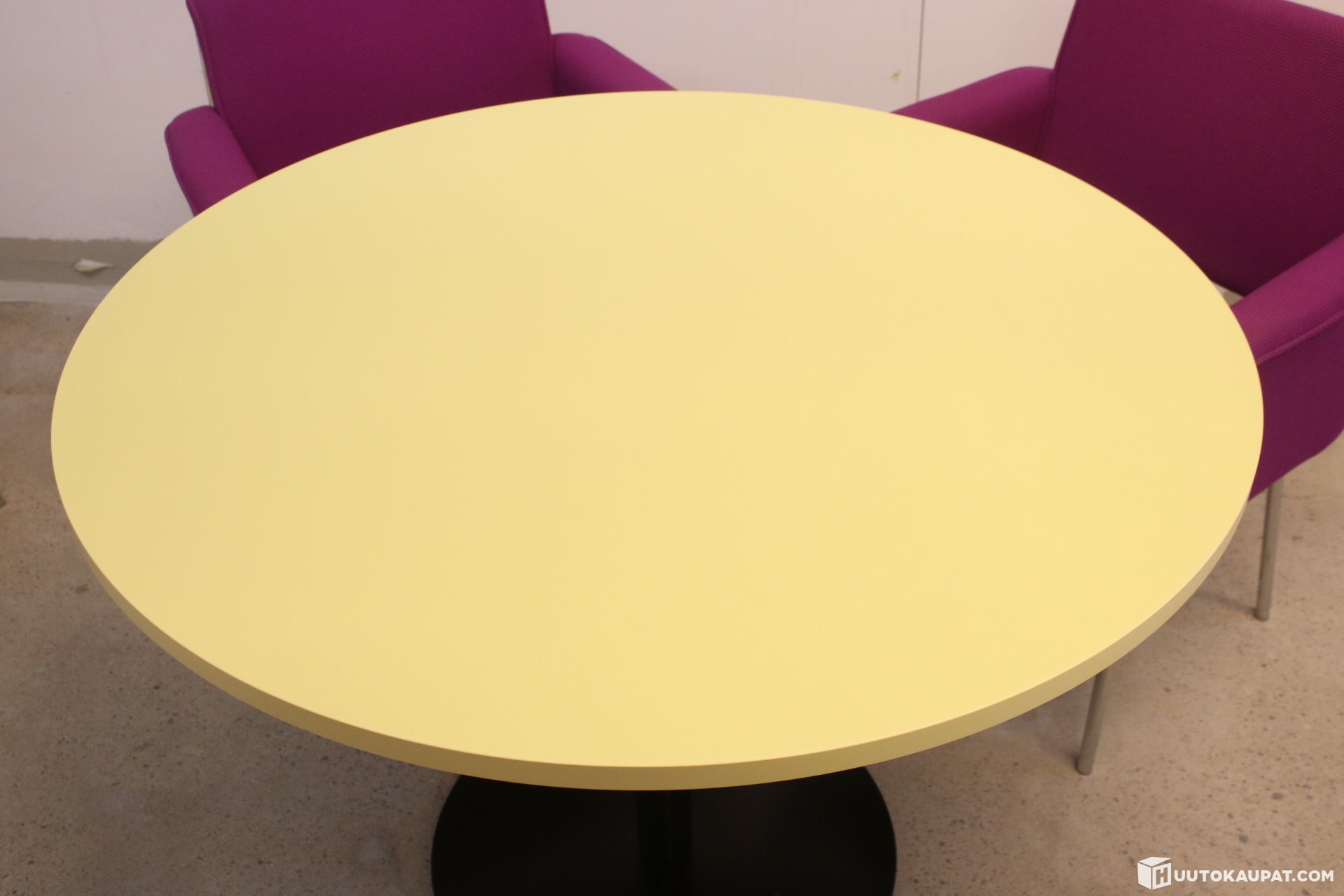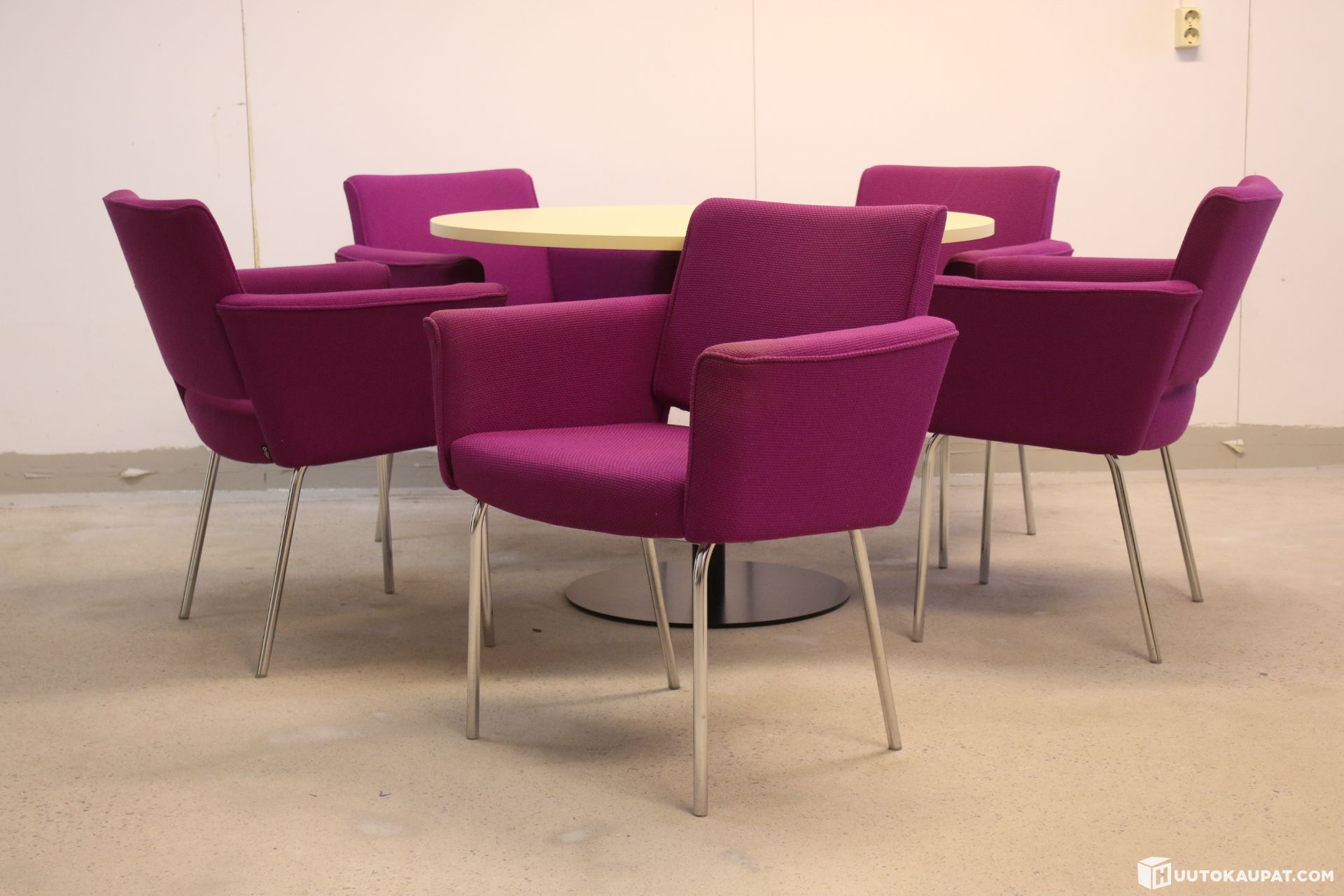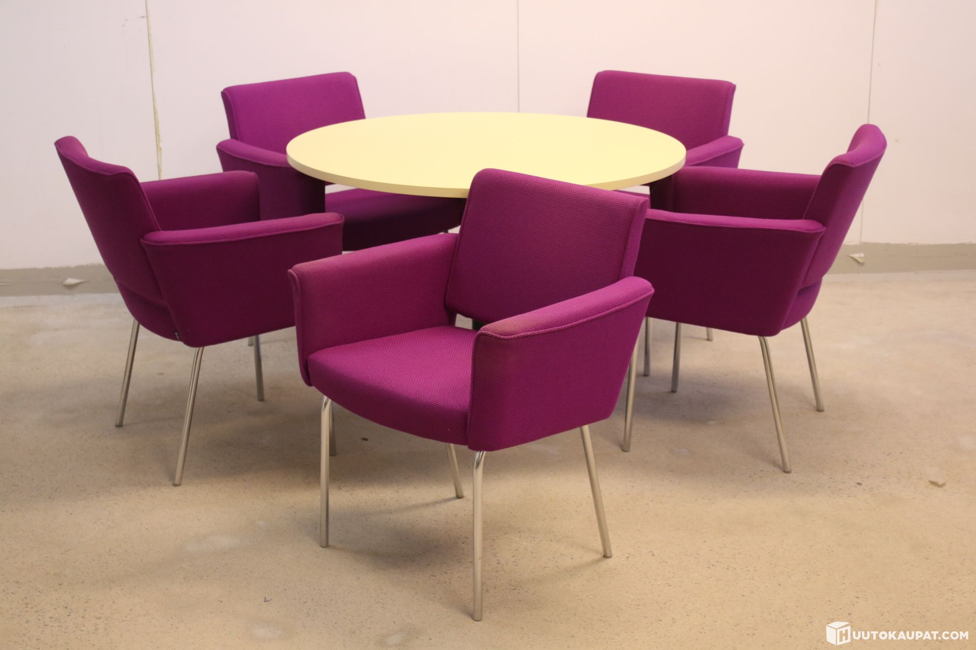 Upea setti viidellä Isku Metro-nojatuolilla sekä uudenkarhealla Martela Spot-pöydällä. Kansi vaalean keltainen ja laippajalka musta.