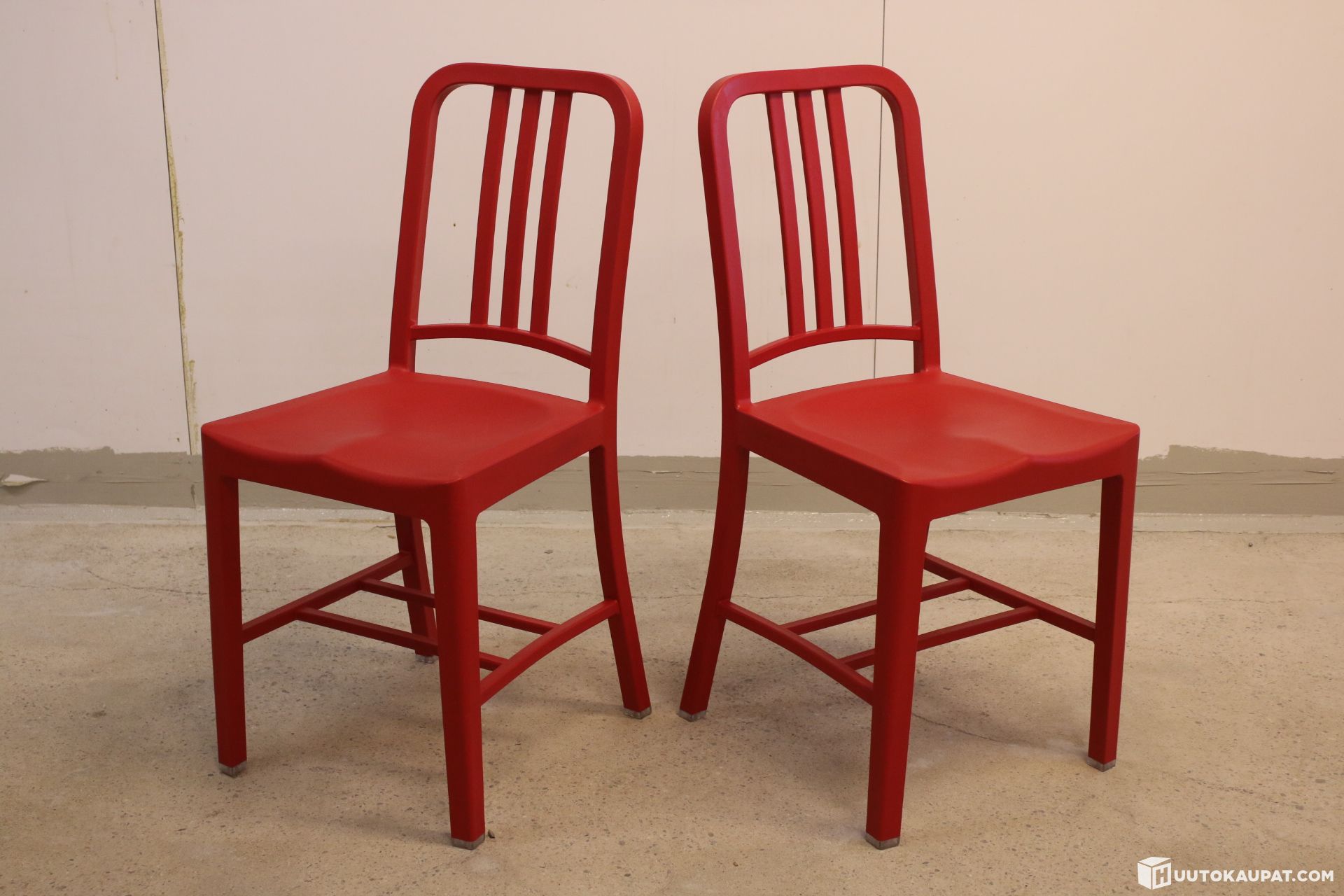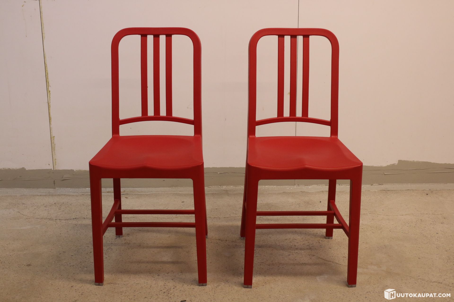 Myynnissä näyttävä pari aitoja Emeco 111 Navy Chair -tuoleja Coca-Cola -erikoisversiona.