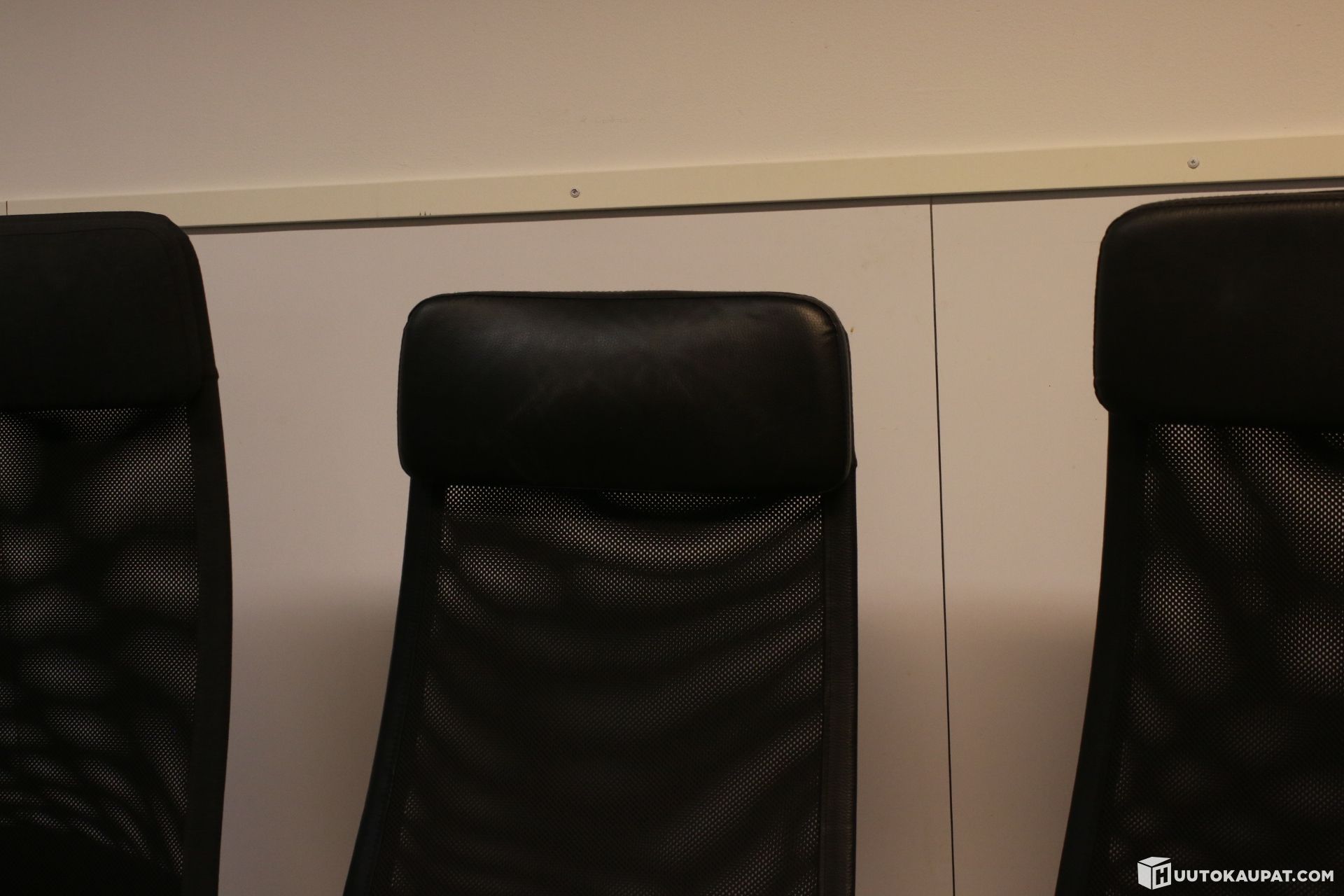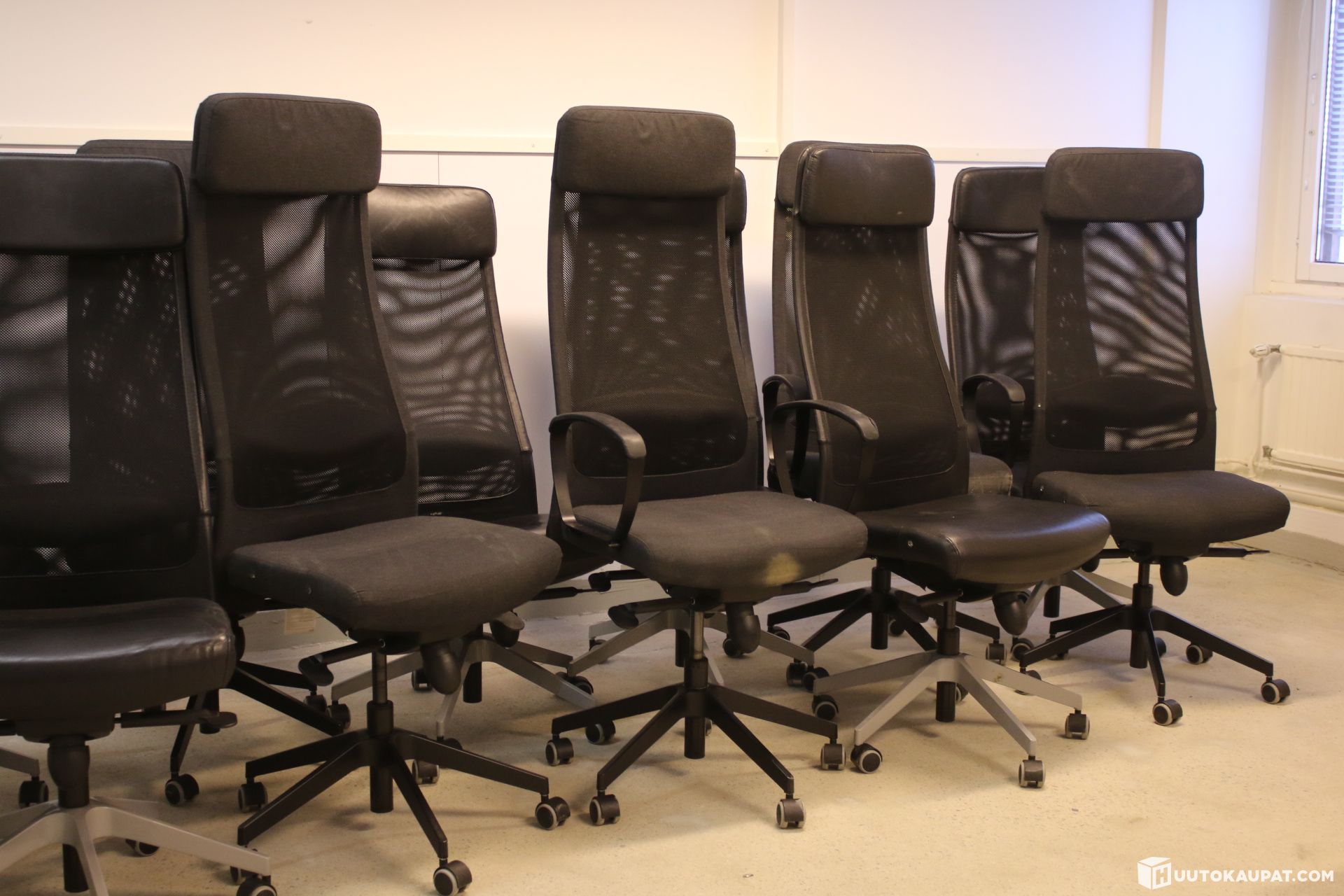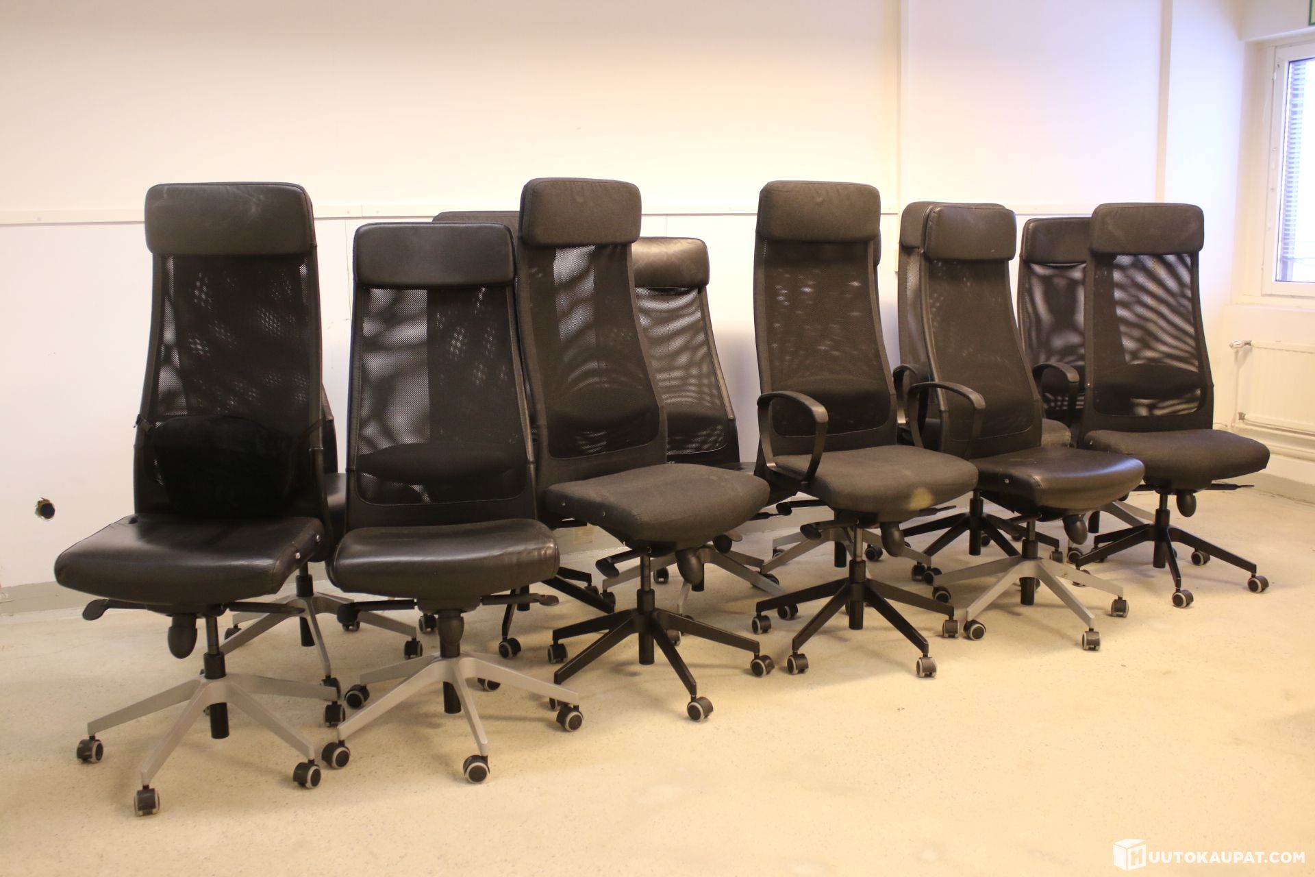 Ikea Markus-työtuoli. Keinonahkaverhoilu ja kangasverhoiltu. Suurimmasta osasta puuttuu käsinojat.