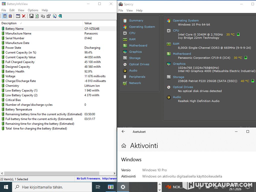 Koneessa uusi 256 GB SSD-levy, myös laturi on uusi.
