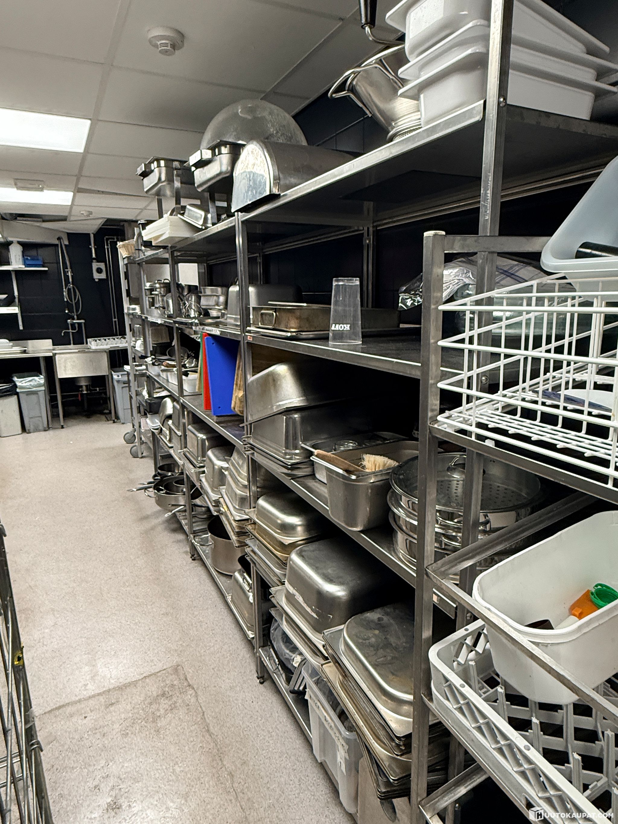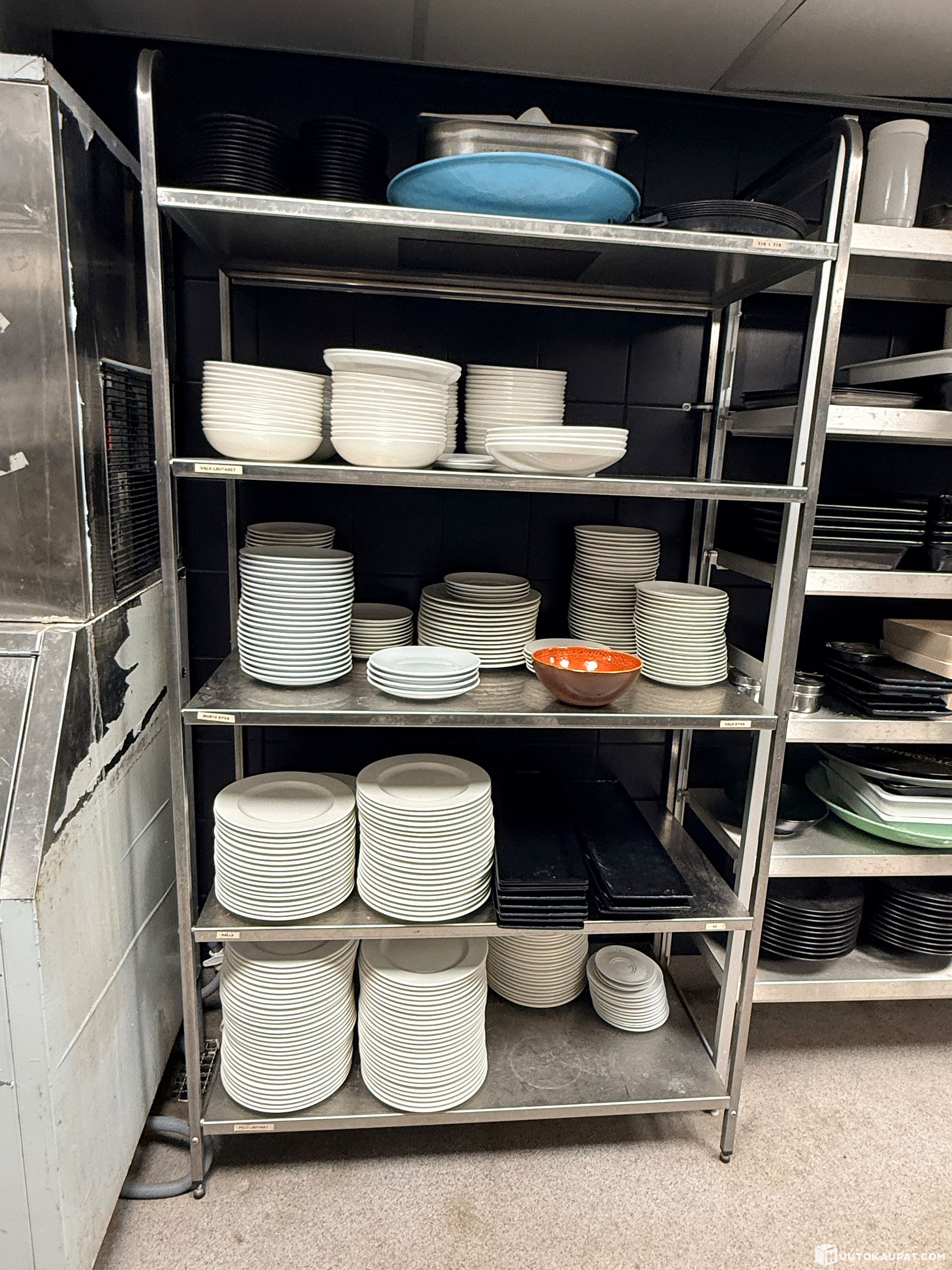 Ammattikeittiöstä peräisin olevat ruostumattomasta teräksestä valmistetut hyllyyksiköt. Raskaan käytön lattiaseisovat hyllyt, jotka soveltuvat astioiden, keittiövälineiden, kuivatuotteiden ja muun keittiökaluston säilytykseen.