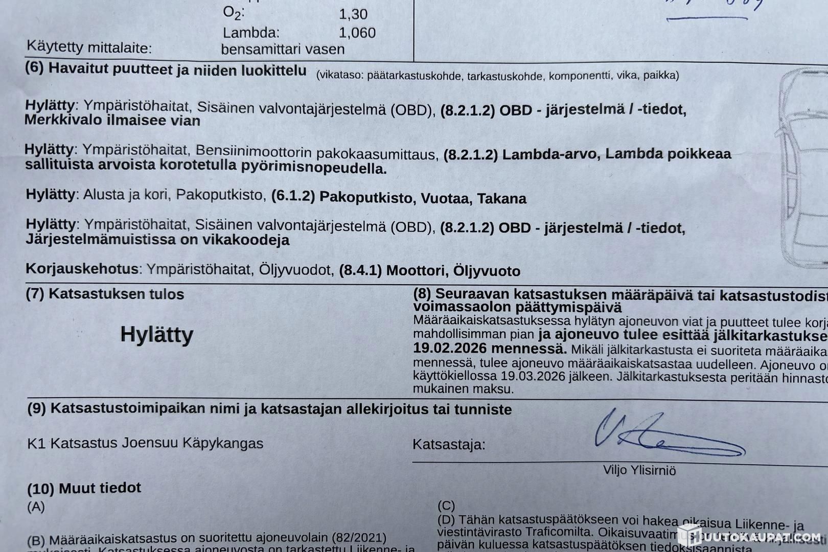 Katsastuksessa päästöistä, pakoputkesta ja moottorin öljyvuodosta huomautus.