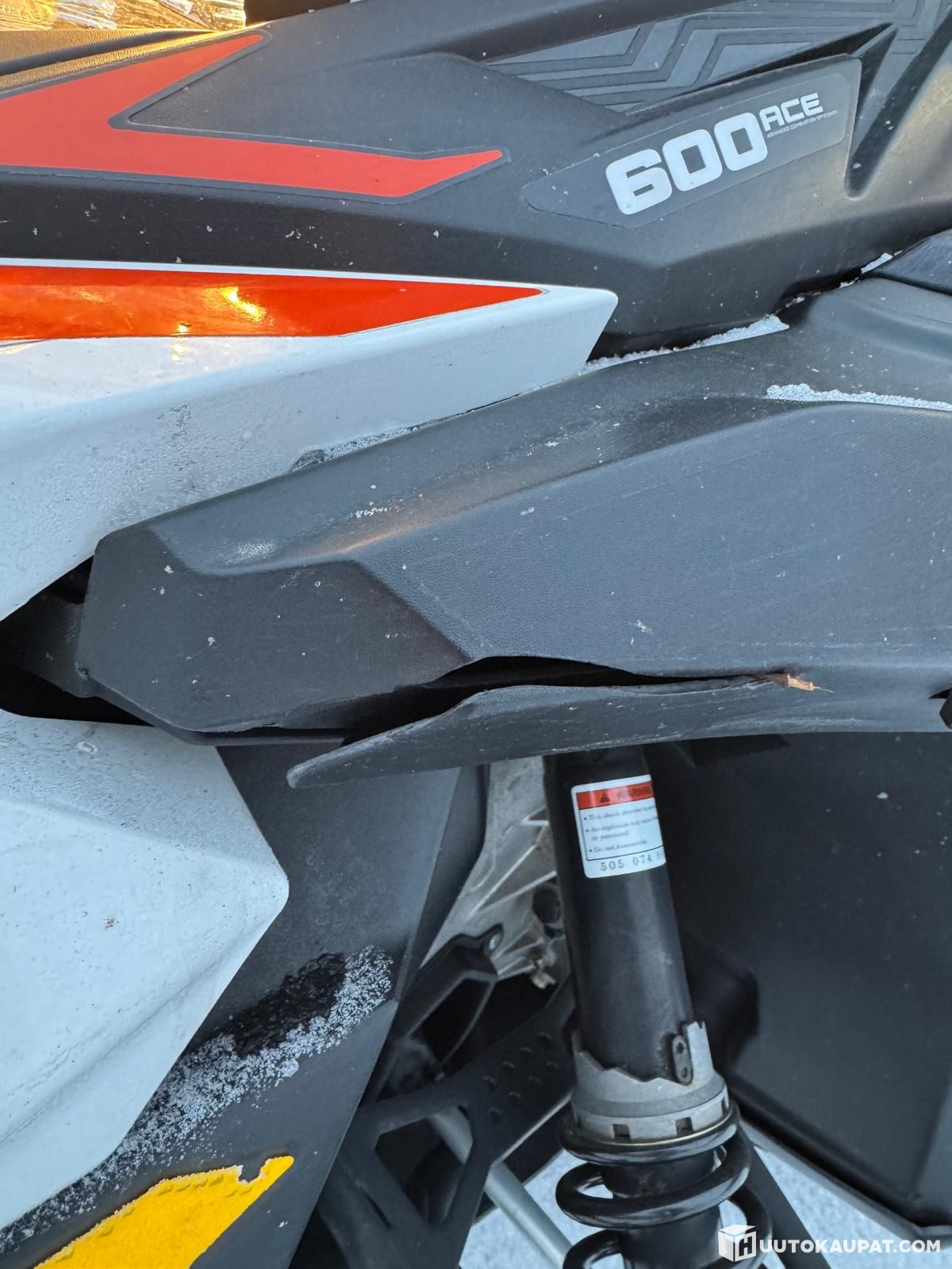 -toinen levikesuksi puuttuu, etupuskurissa painauma, kuomu halki, telastosta rulla rikki, kt. kuvat.
