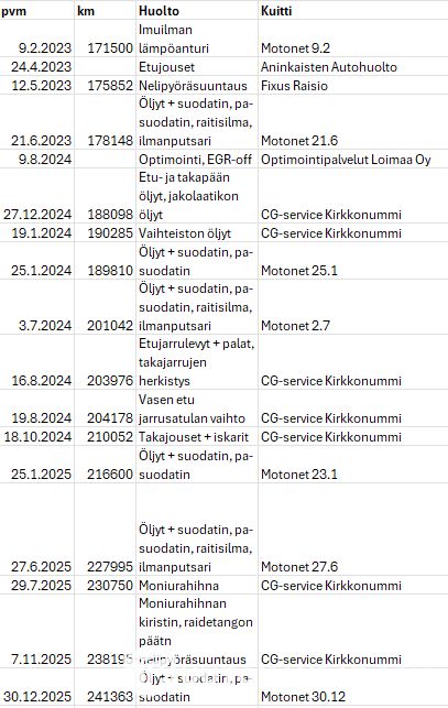 Kattava huoltohistoria, öljynvaihtohuollot tehty itse ja loput liikkeessä.