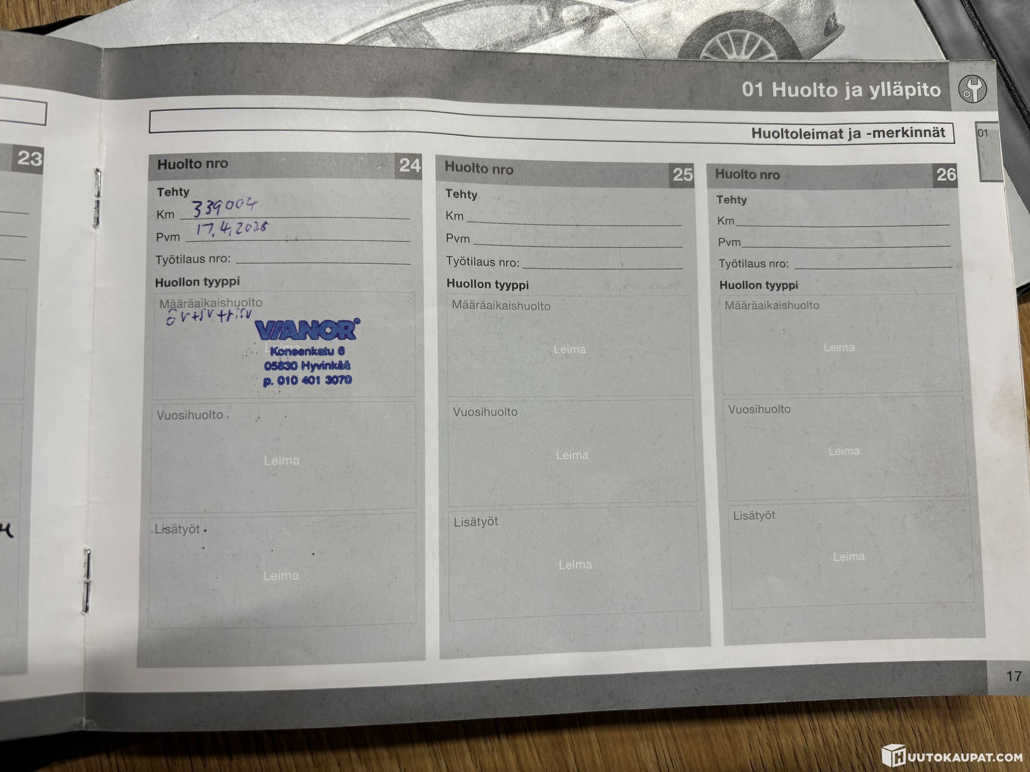 Viimeisin huolto tehty 339004km kohdalla, 04 / 2025