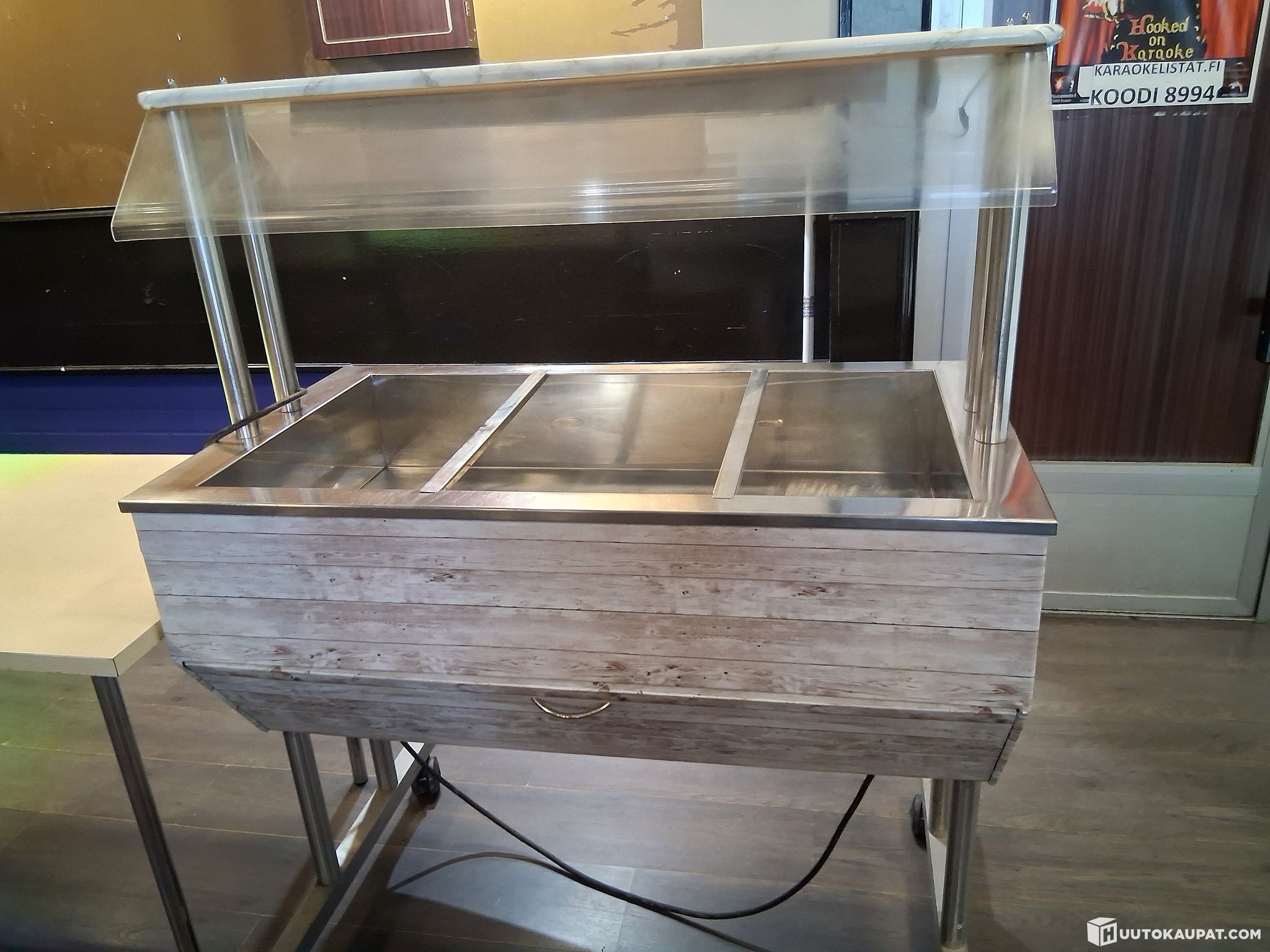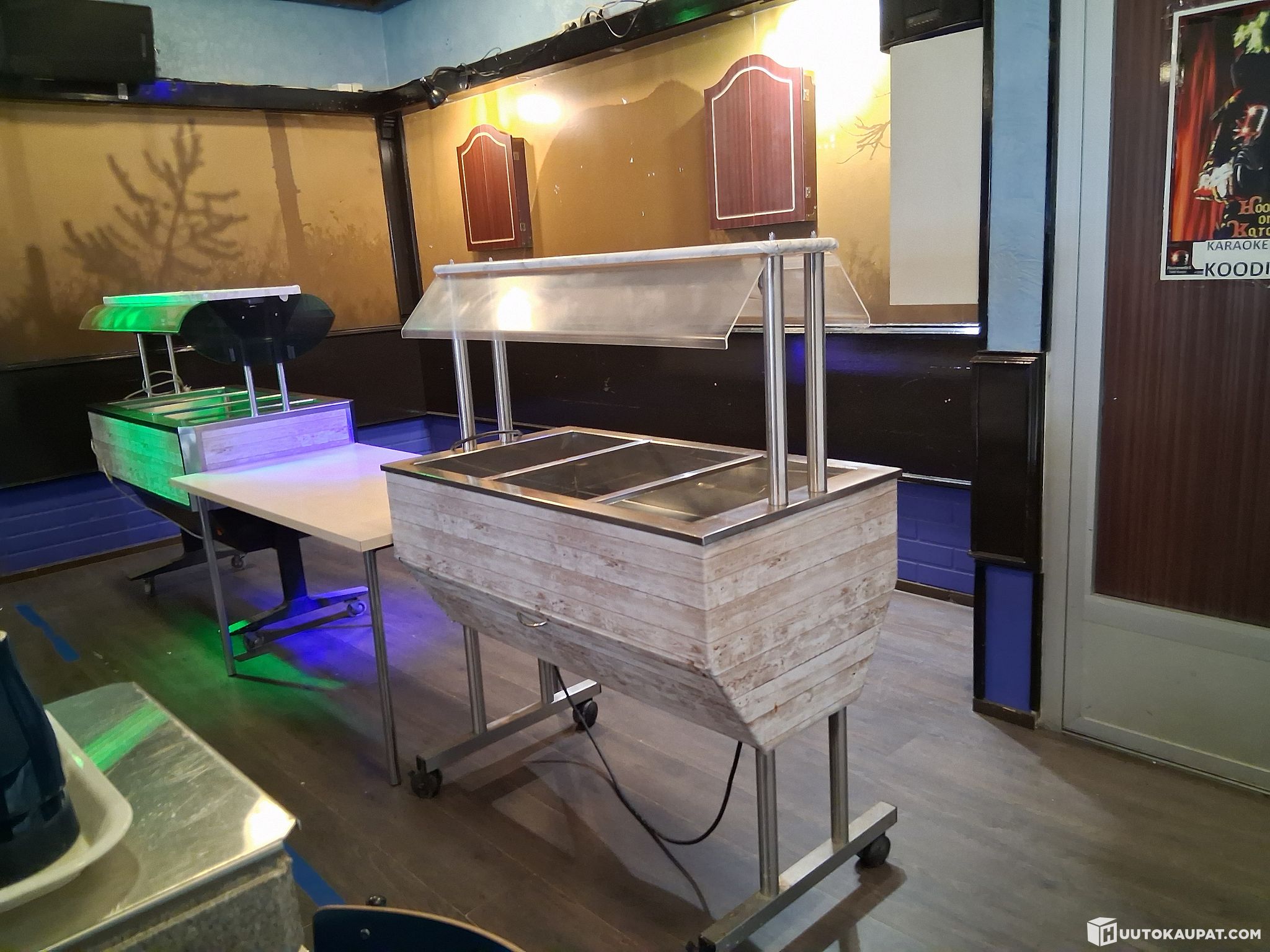Käytetyt käytöstä poistetut kylmä ja lämpöpöydät sekä apupöytä kaikki toimivana käytöstä poistettu ja ihan siisti kuntoiset ollut meillä lounas käytössä nyt ei enää tarvetta. Molemmissa renkaat alla helpottaa siirtämistä.