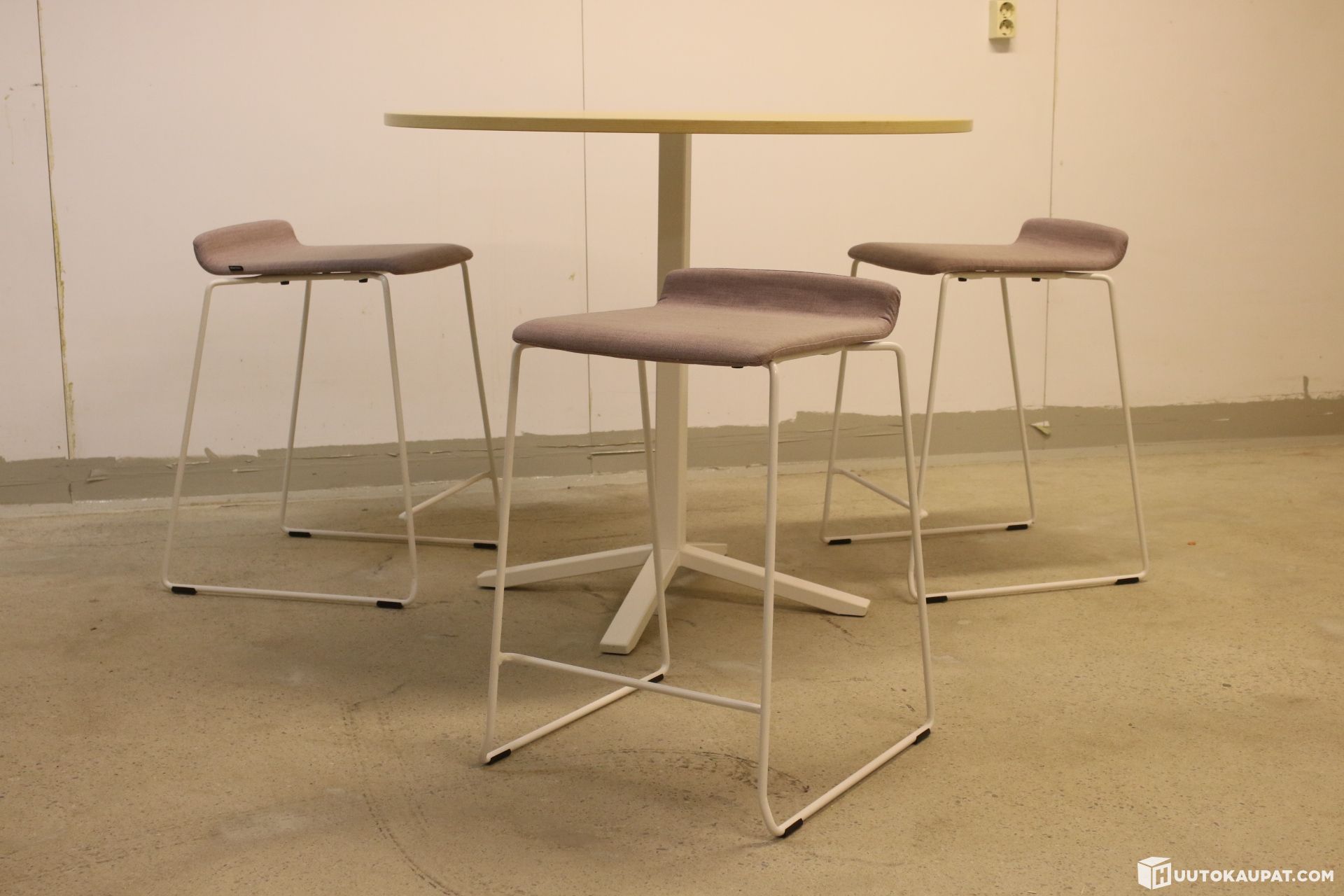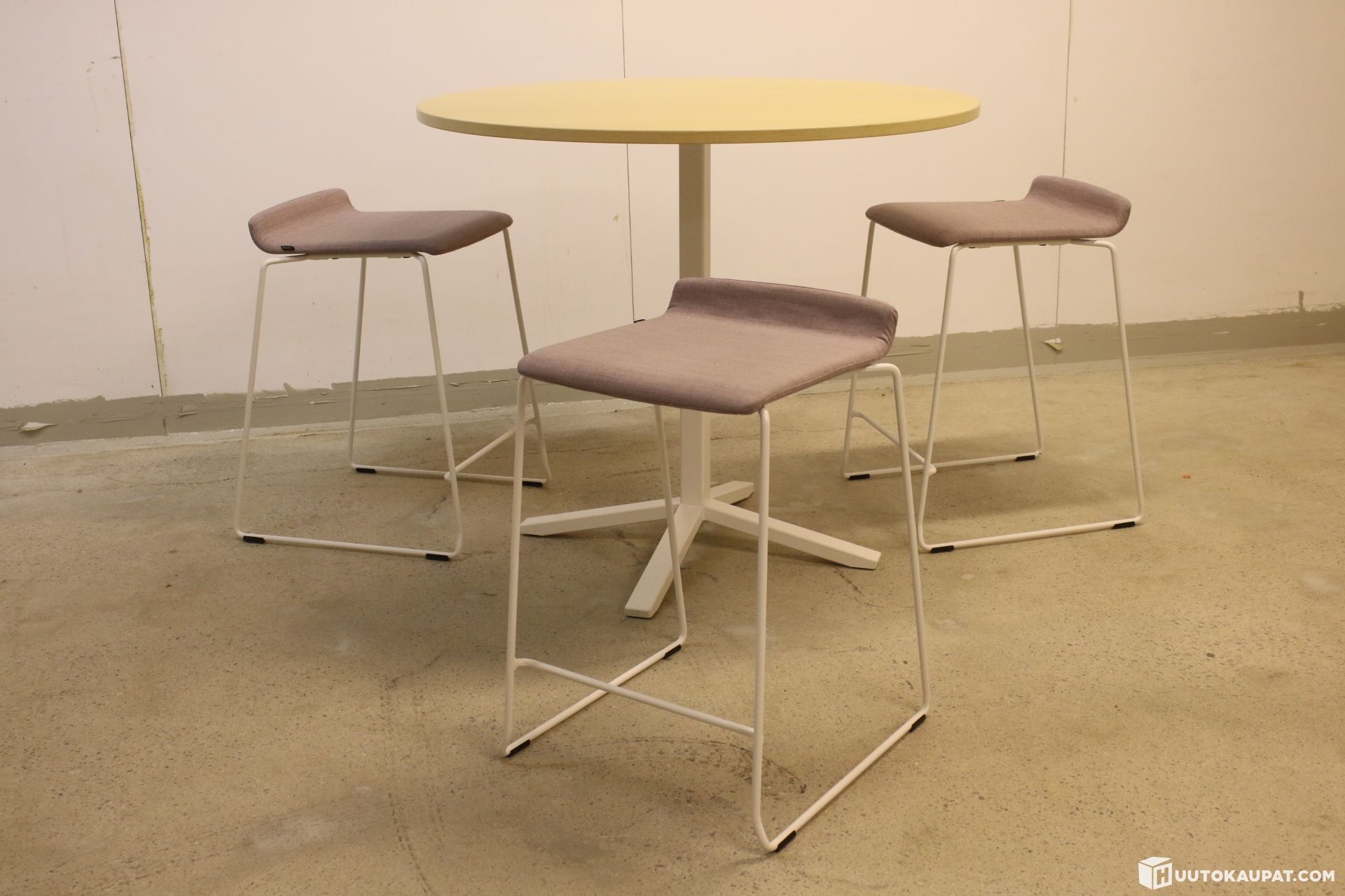 Kolme kappaletta Martela Form-tuoleja sekä Alku-baaripöytä. Tuolien väri on pinkihtävä.
