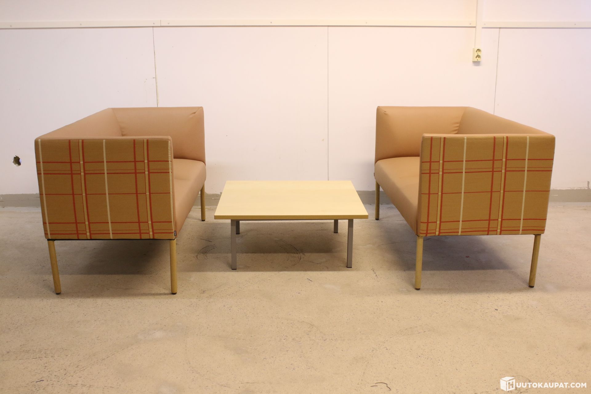 Todella tyylikäs Martelan sohvaryhmä kahdella Noora-sohvalla sekä Cube-sohvapöydällä. Sohvien istun ja selkänoja verhoiltu vaaleanruskealla keinonahkalla.