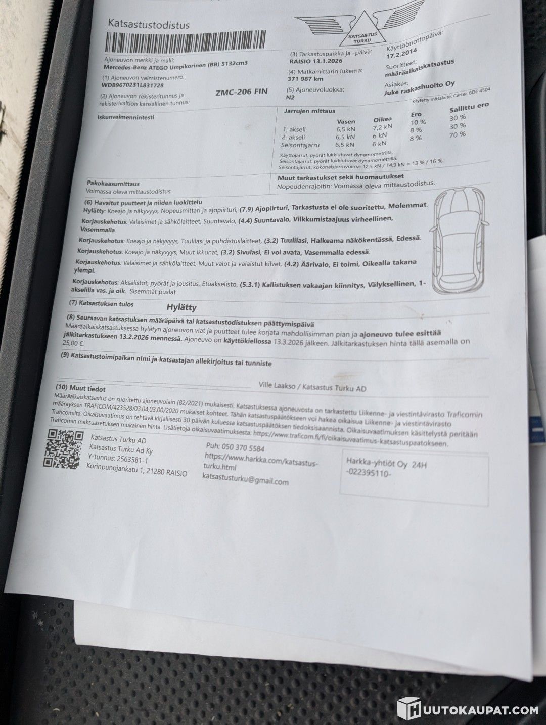Leima on voimassa 3.3 asti ja autoa on käyty jo näyttämässä uutta leimaa varten, muutama korjauskohde jotka ilmenee kuvasta.