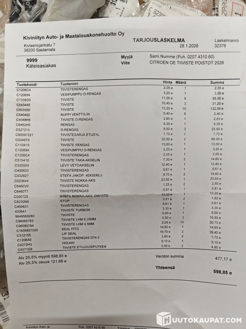 Myynnissä laaja Citroen varaosapaketti, joka sisältää runsaasti eri osia mm. ovenkahvoja, lukkoja, oven rajoittimia, jousipalloja, kumityynyjä, laakereita, säätölevyjä, radion, antureita, muita sähköosia, sytytystulppia, tiivisteitä, katkaisijoita, pultteja sekä käsijarruvaijereita. Osista saatavilla tarkemmat PDF-listat liitteissä, ja ilmoituksen kuvissa näkyvät lähikuvat pakkausten tuotenumeroista helpottamaan yhteensopivuuden tarkistamista