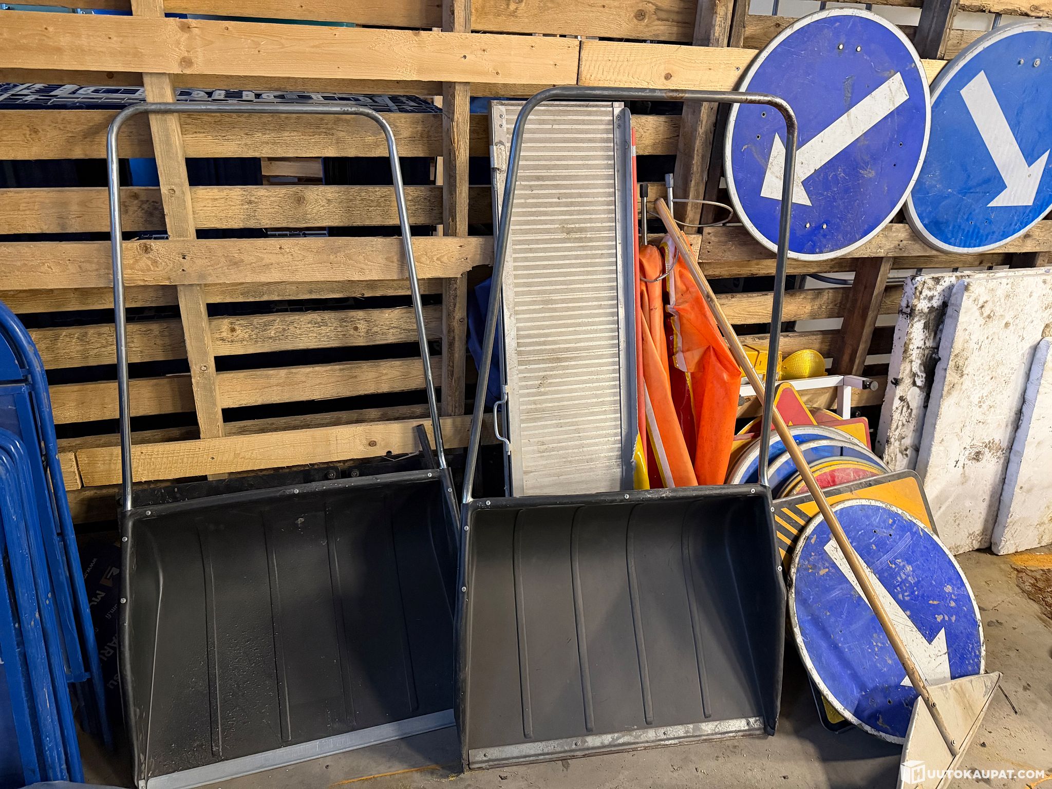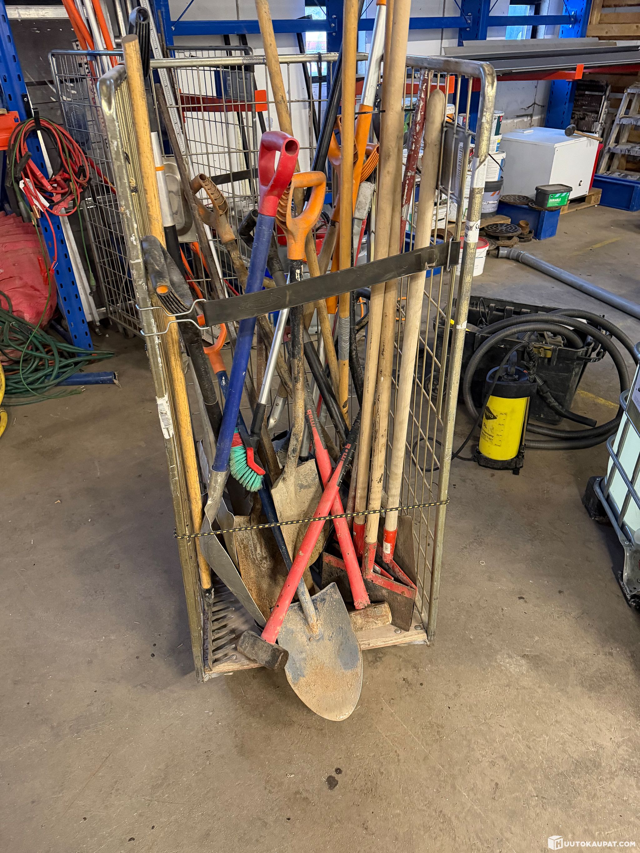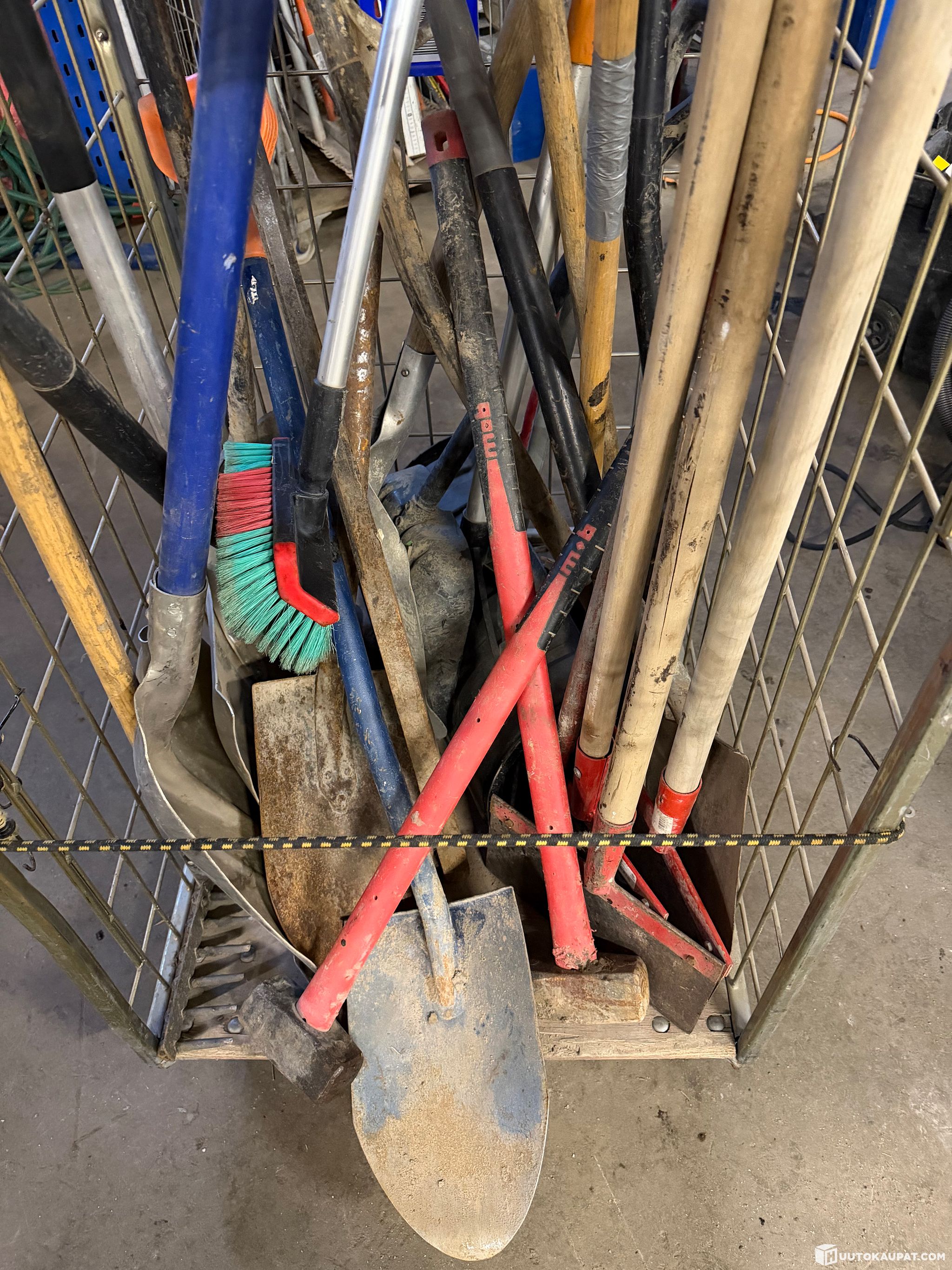 Kahdessa rullakossa olevat tavarat (lapioita, harjoja, lastoja yms tavaraa)