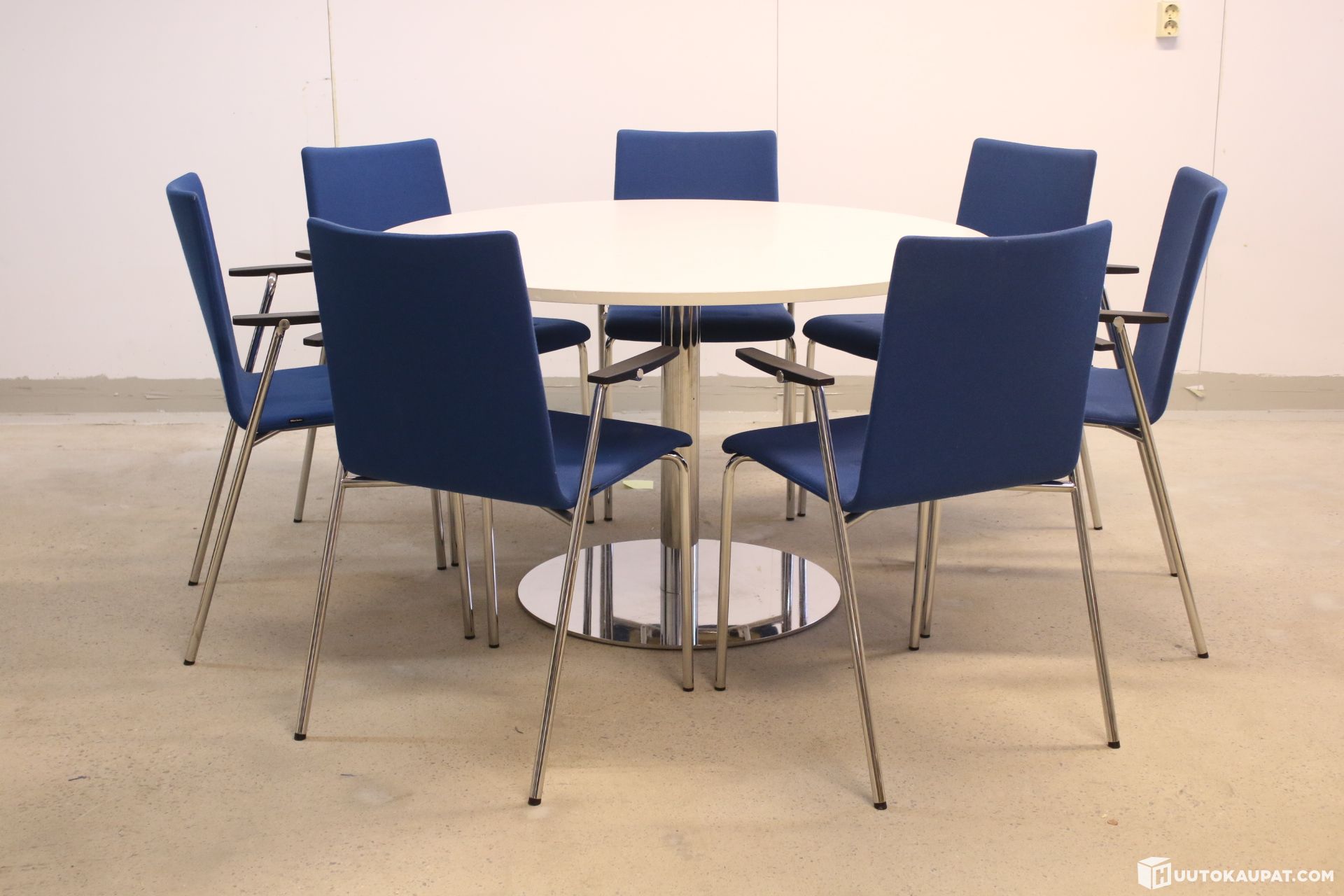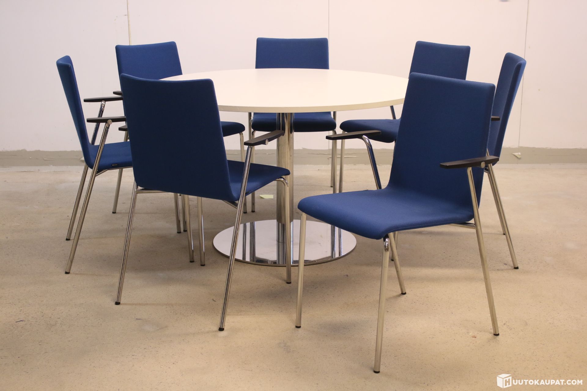 Seitsemän pinottavaa Martela Form-tuolia ja suuri kokoinen tukeva Spot-pöytä.