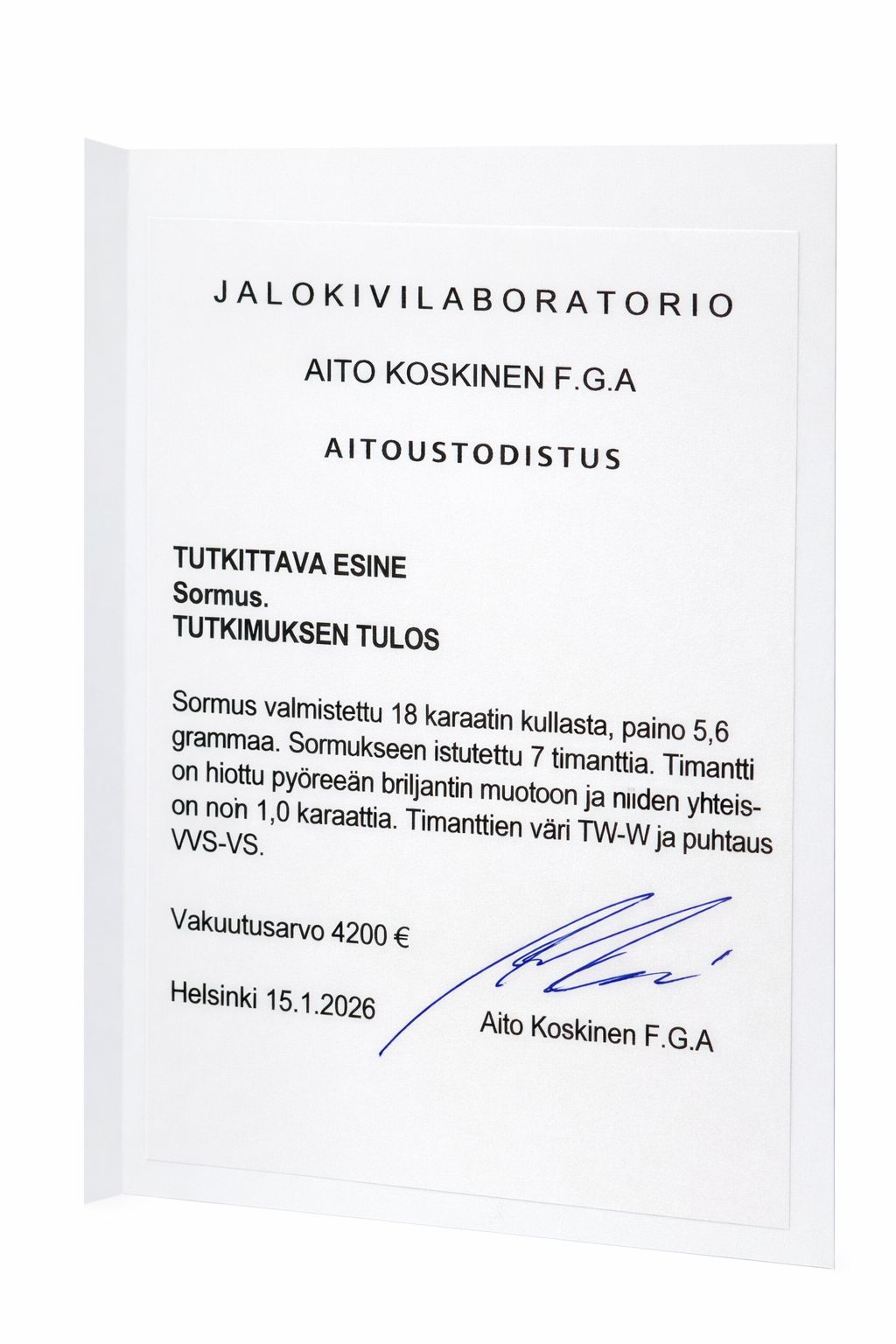Aitoustodistus / gemmologin arvio