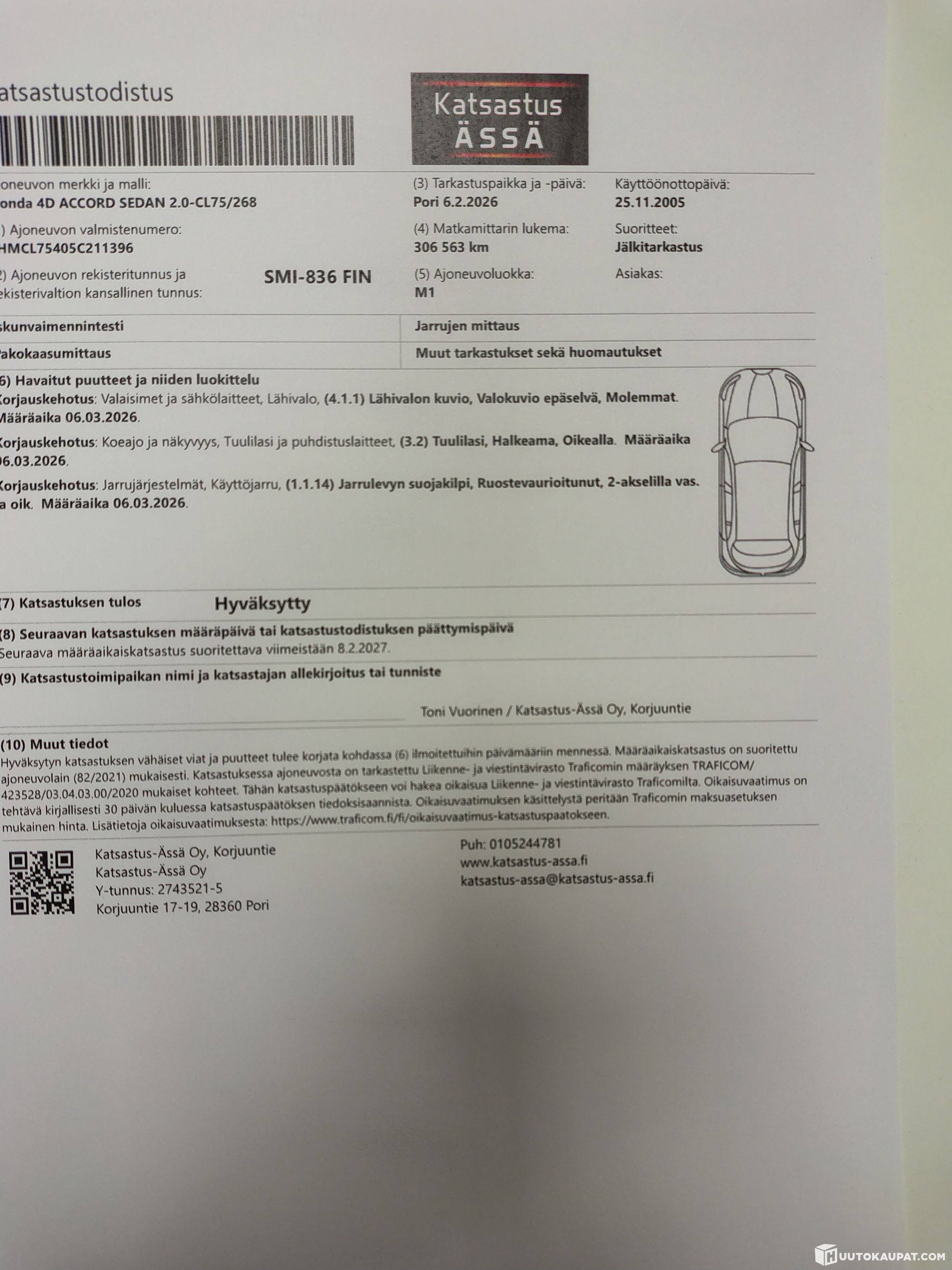 Katsastuksessa muutama korjauskehoitus, kohteet löytyvät kuvista katsastustodistuksessa.