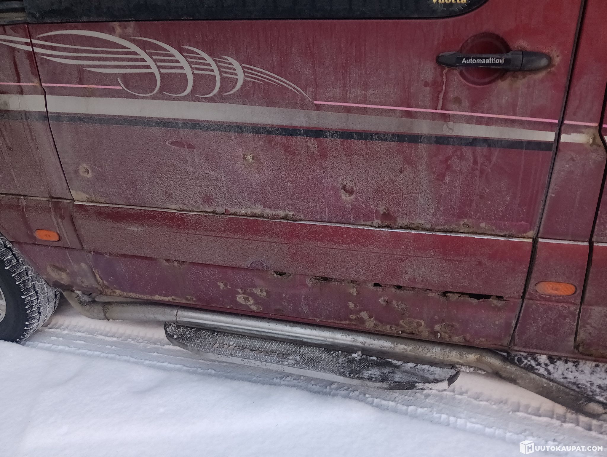 Kyllä, maalipinta kuppanen, pintaruostetta ja sivuovessa läpireik. Tästä huomautus katsastuksesta