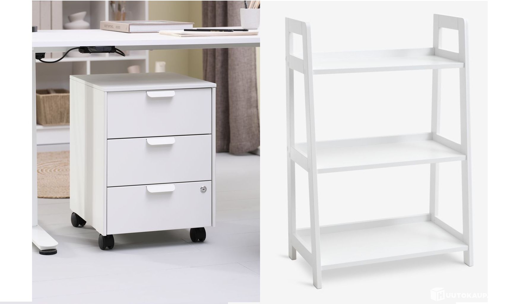 Valkoiset uudet työpöytälipasto ja hyllykkö, Imatra