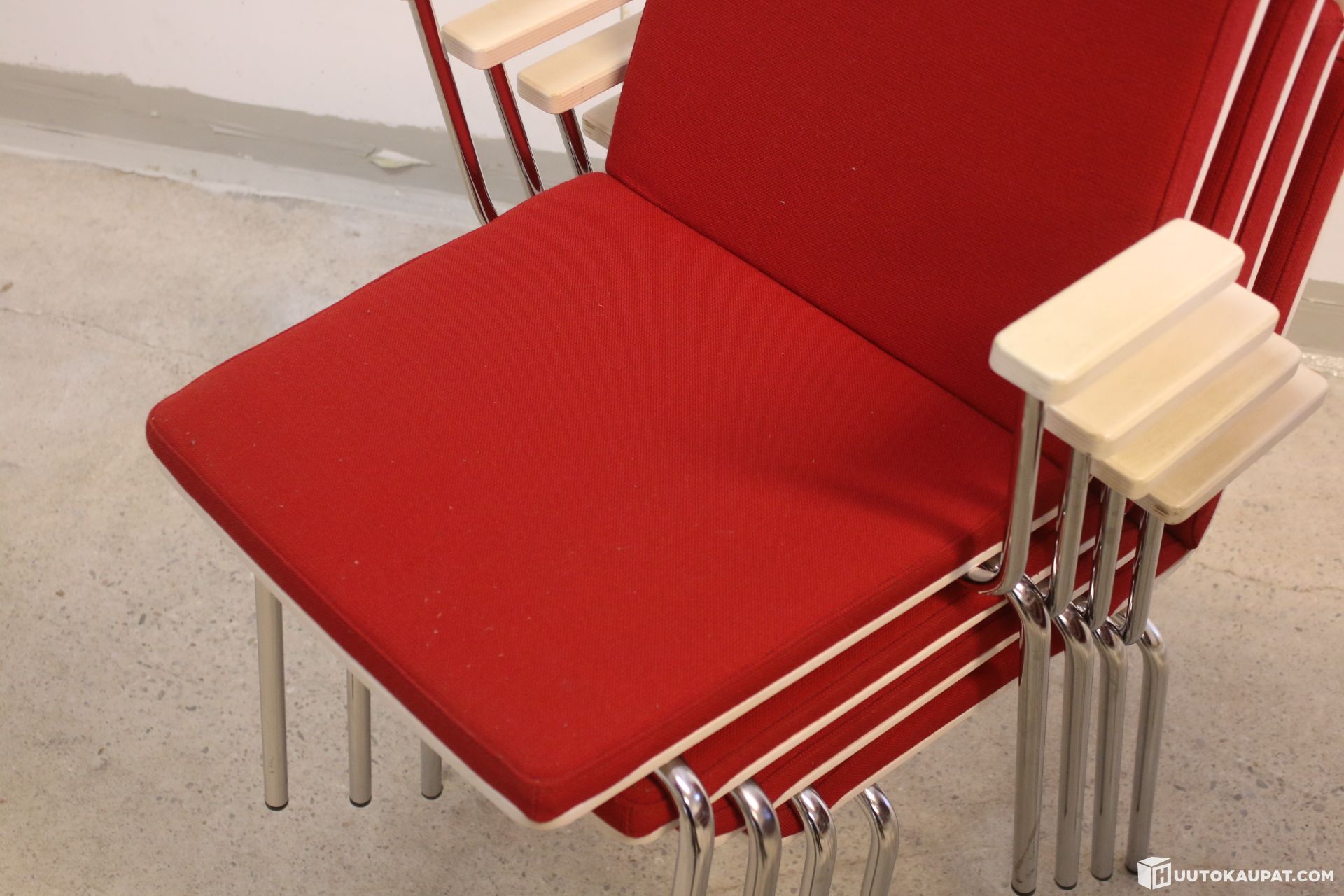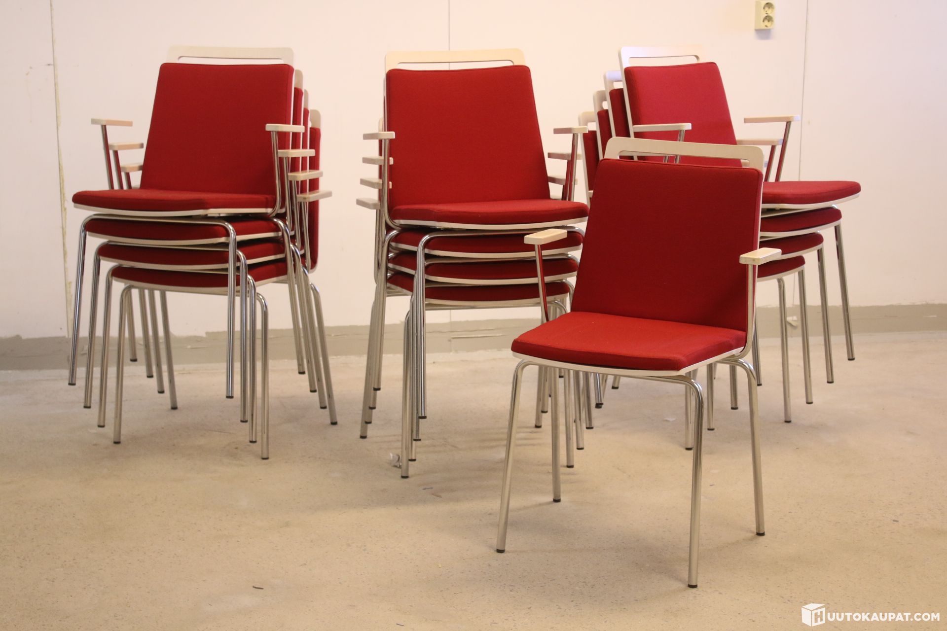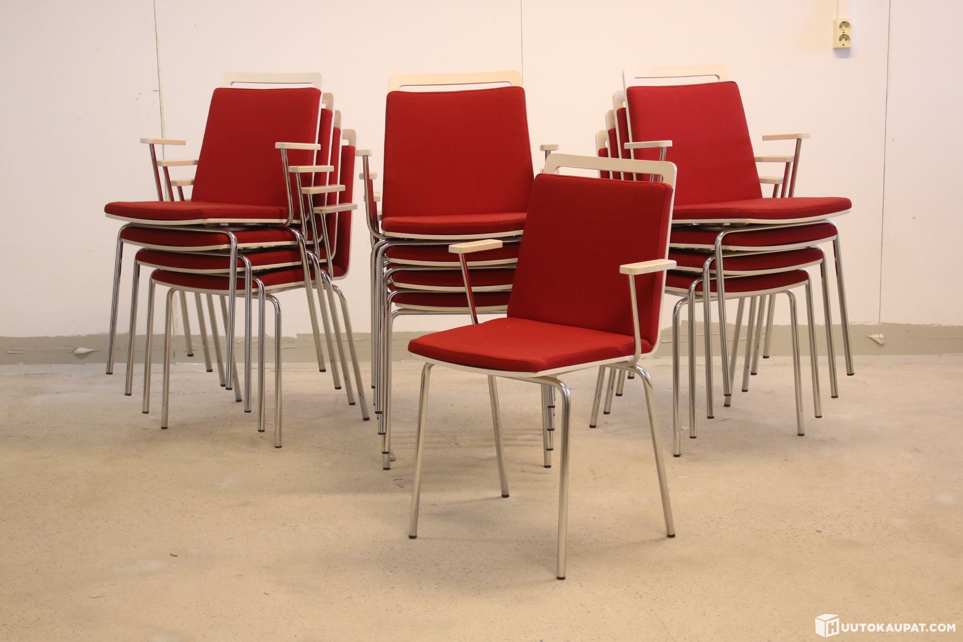 13 kappaletta hyvä kuntoisia pinottavia käsinojallisia tuoleja.
