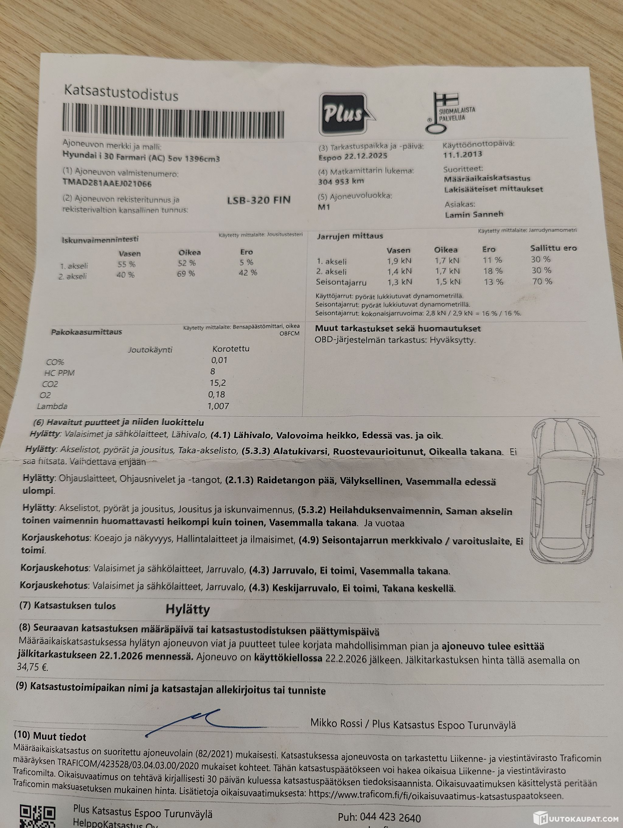 Katsastuksessa huomautettu/hylätty seuraavista kohdista: