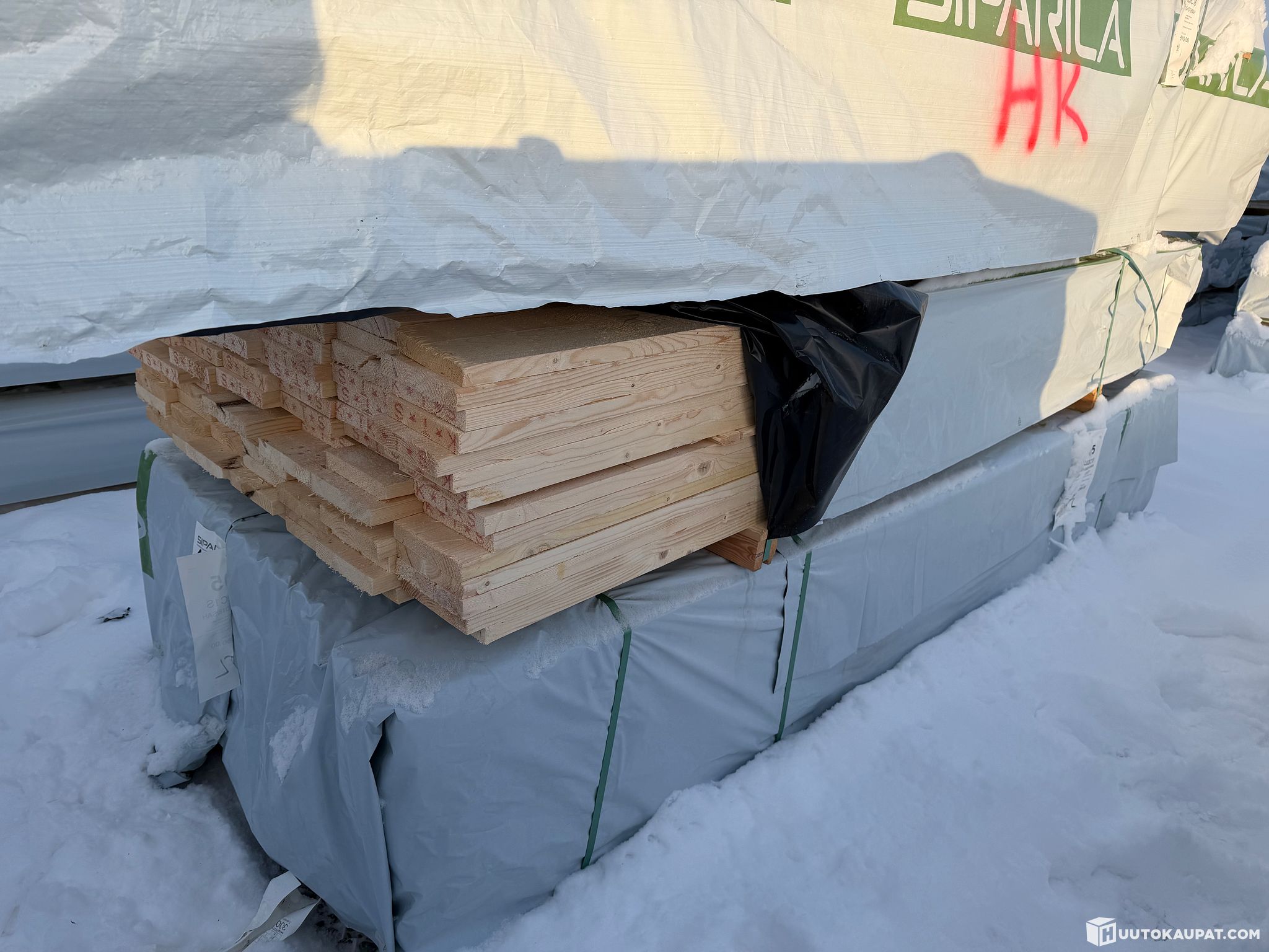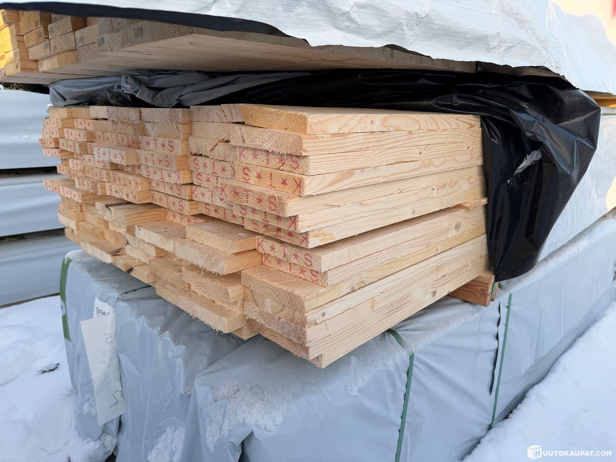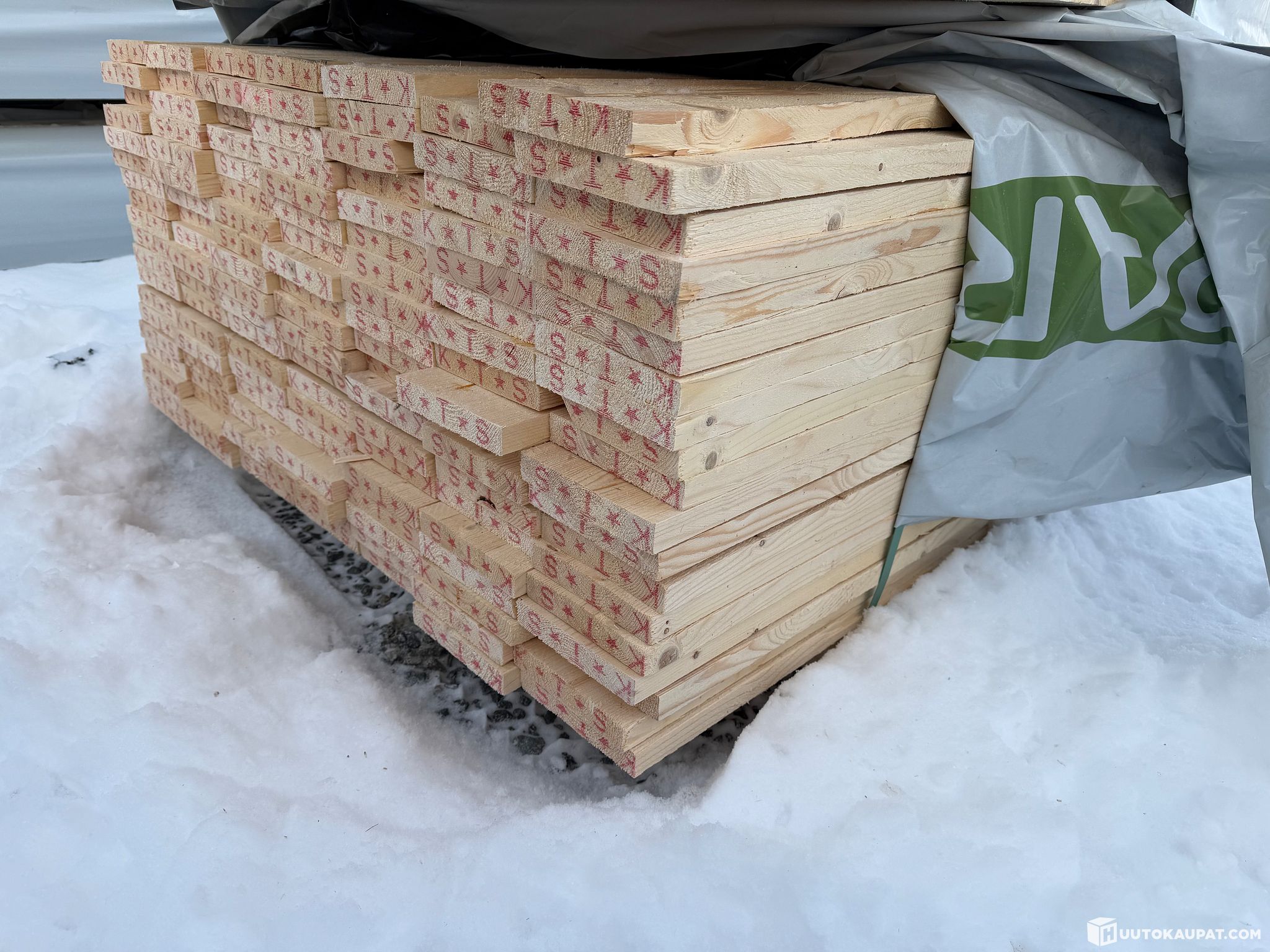 Monikäyttöistä sahatavaraa tehtaan paketissa.