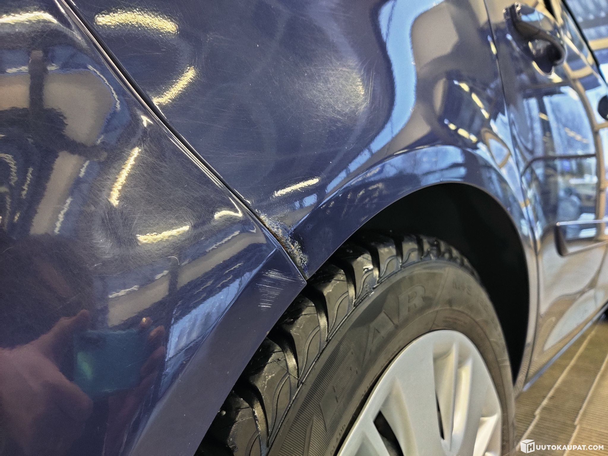 Joitakin käytönjälkiä korista luonnollisesti löytyy, mutta yleisilmeeltään auton on vallan ryhdikäs, sisältä jopa todella siisti. Takana pyöränkaaressa pieni lommo.