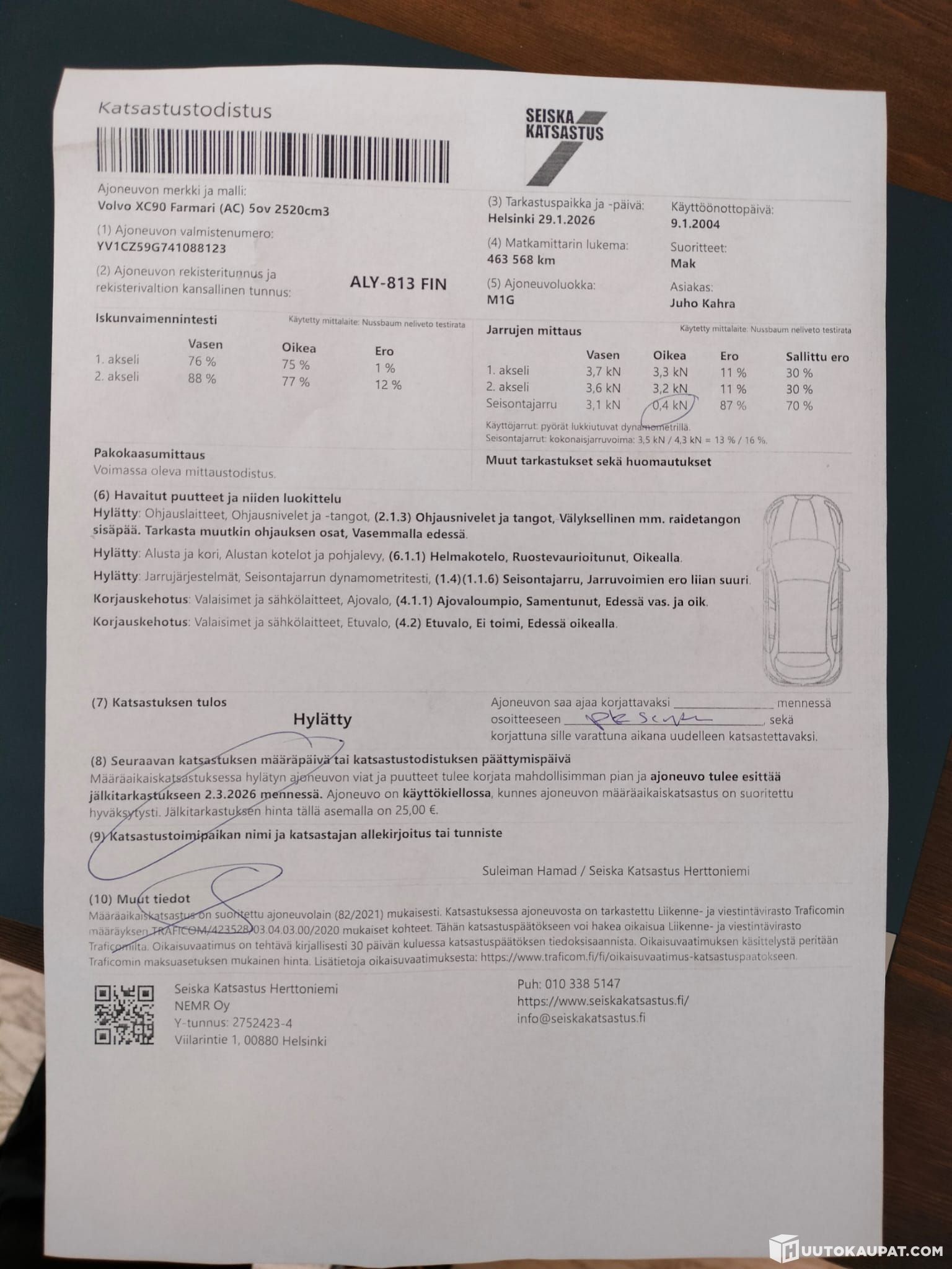 Katsastuksessa seuraavat hylätyt, jälkitarkastus suoritettava 3.2. mennessä.: Oikea helma takaa ruosteessa, raidetangonpää väljä, alapallonivel väljä, käsijarrussa ei riittävästi pitoa (korjauksen kustannusarvio 1200€)