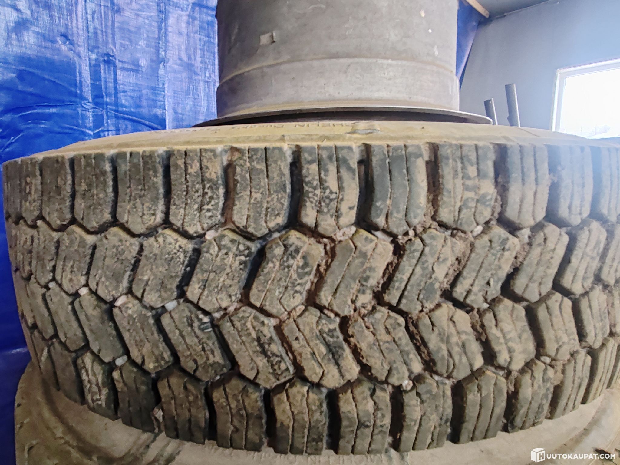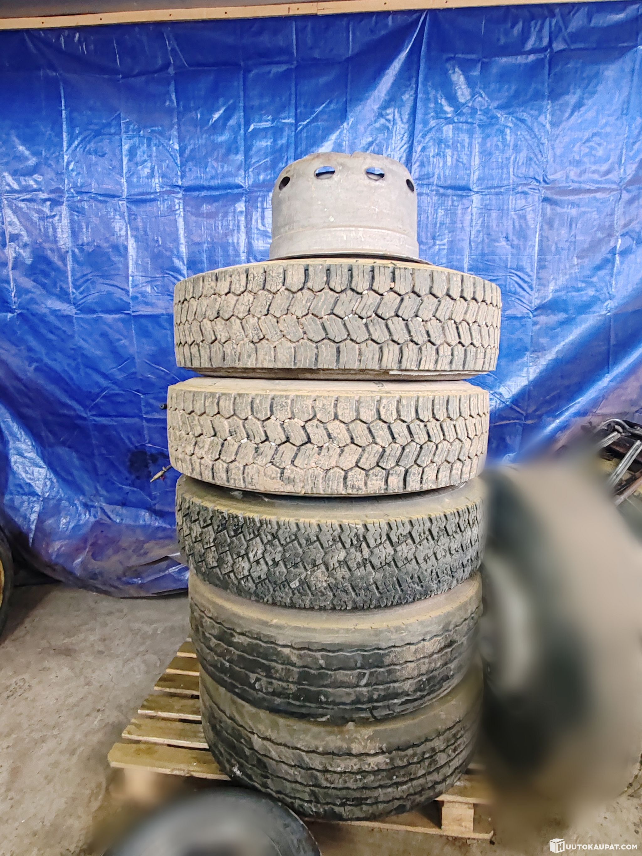 Huutokaupataan kuvissa näkyvät (sumentamattomat) otsikon mukaiset renkaat Scanian vanteineen.