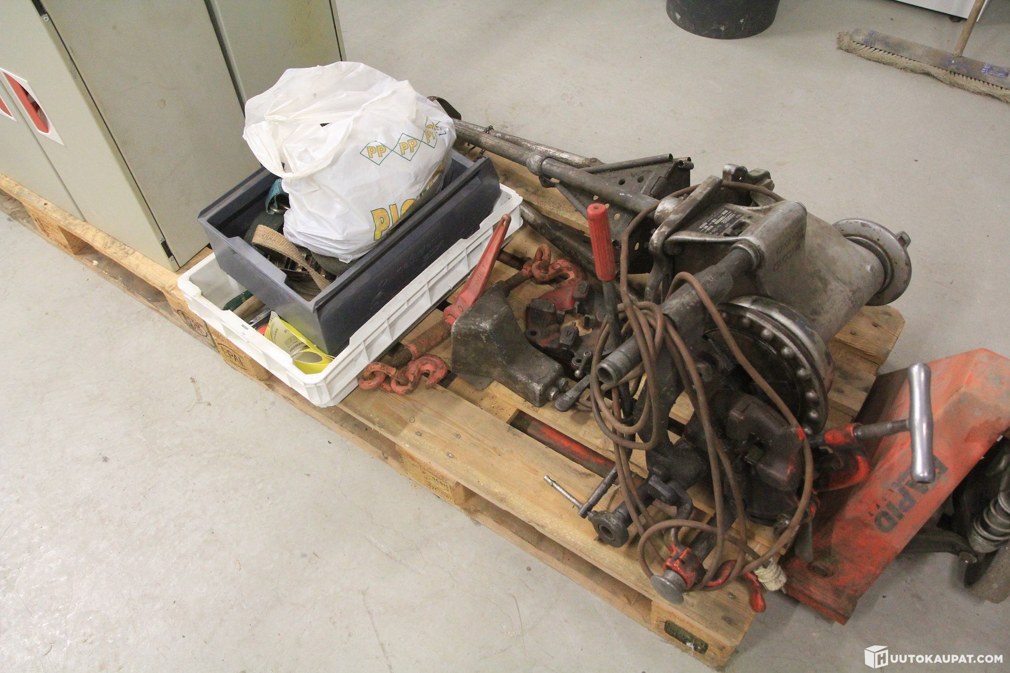 Ridgidin iso kierteytyskone, IV -tarvikkeita, palopostikaapit letkuineen, imurit 2 kpl, eristeitä, sähkömoottoreita, kannakkeita, porraskiipijä Cargo Master (akku uusittava)