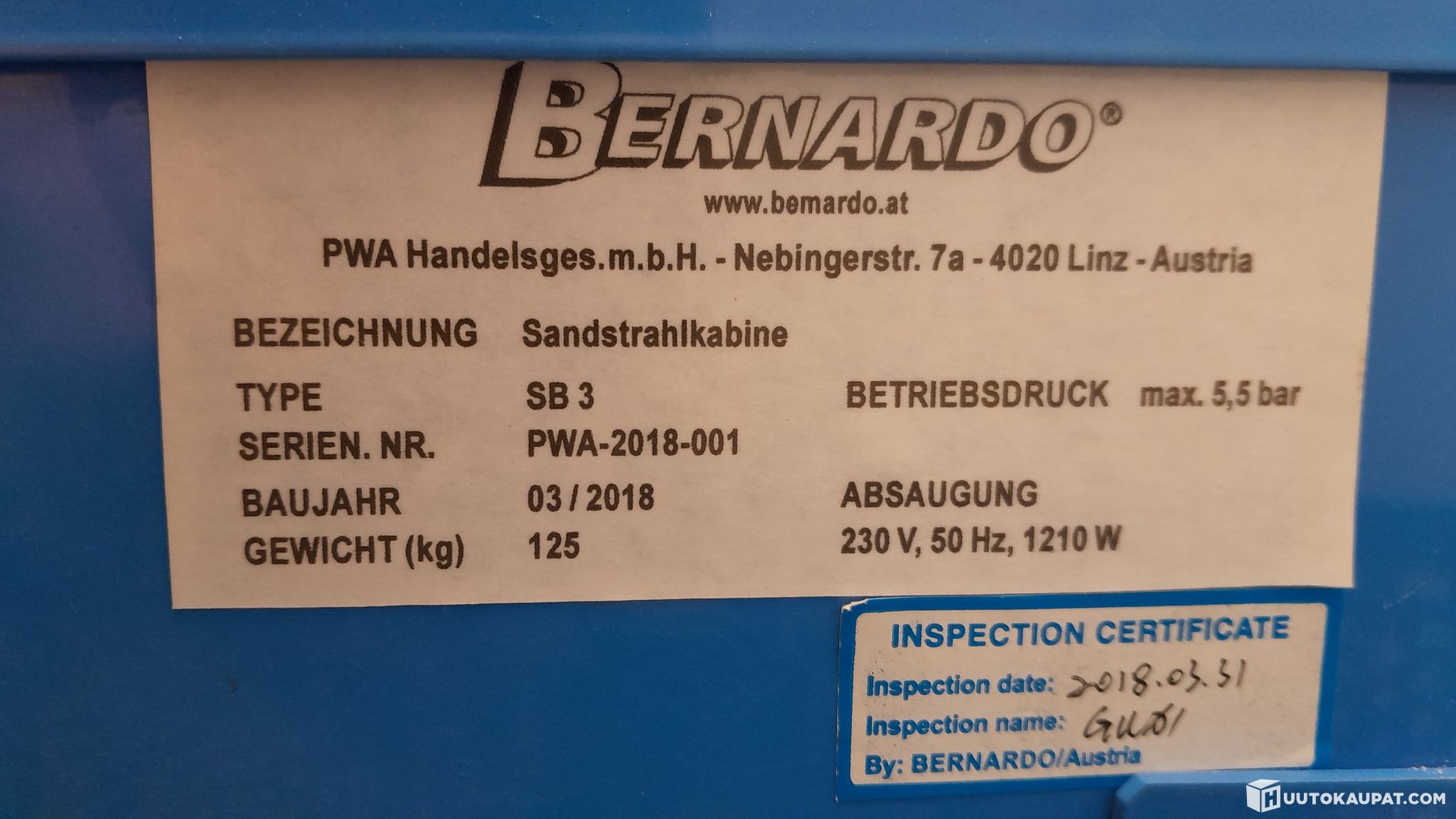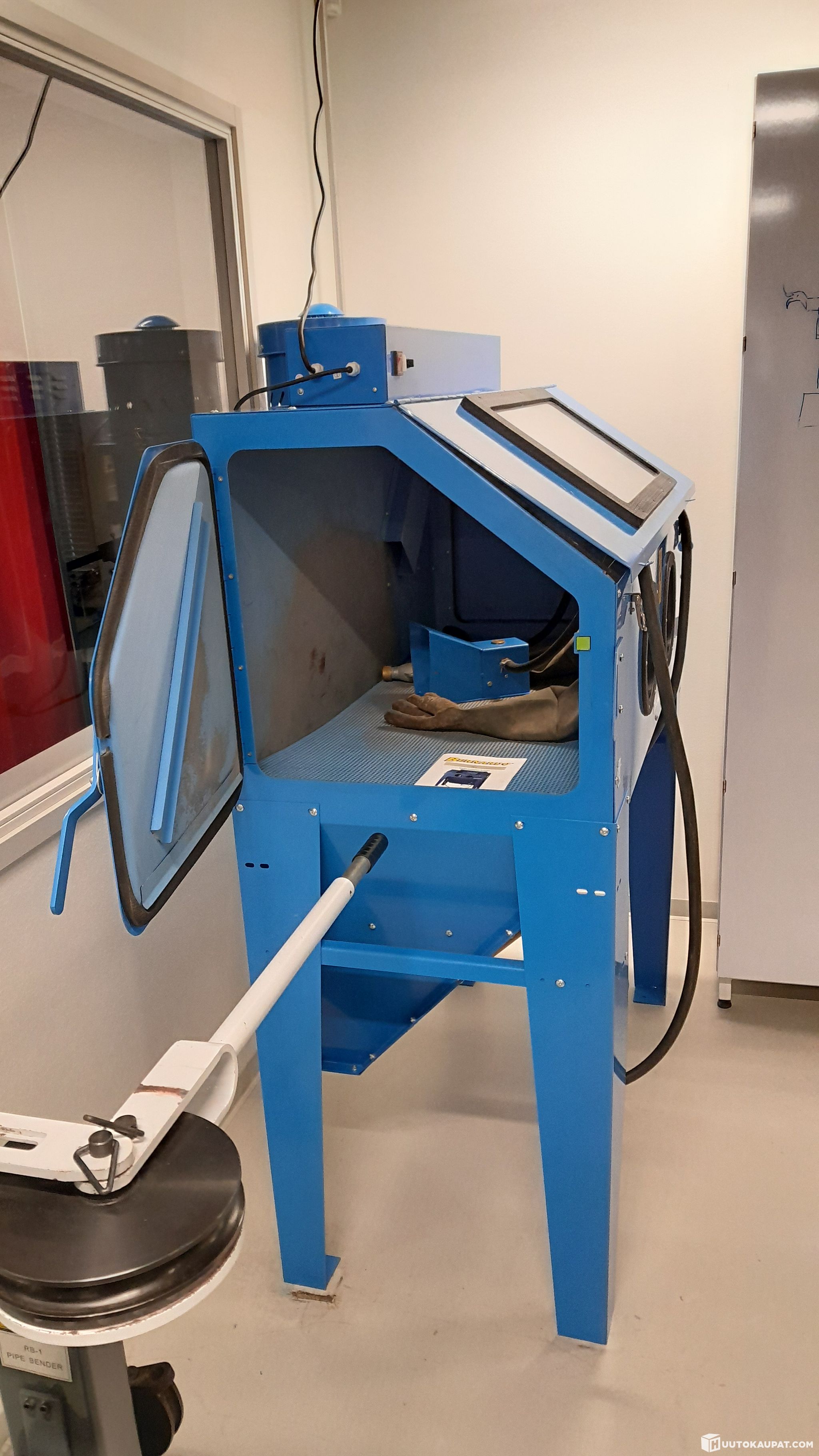 Toimintakunto: Myydään kunnostettavaksi. Laitteen tiivisteet vaativat uusimista. Imurin suodatinkotelo on liimattu umpeen ja liimamassa täytyy poistaa imurin huoltamiseksi. Kaappi on tyhjennetty puhallusmediasta, mutta suodattimessa, letkuissa ja rakenteissa on niiden (teräsrae, hiekka, sooda) ja puhallettujen kappaleiden jäämiä.
