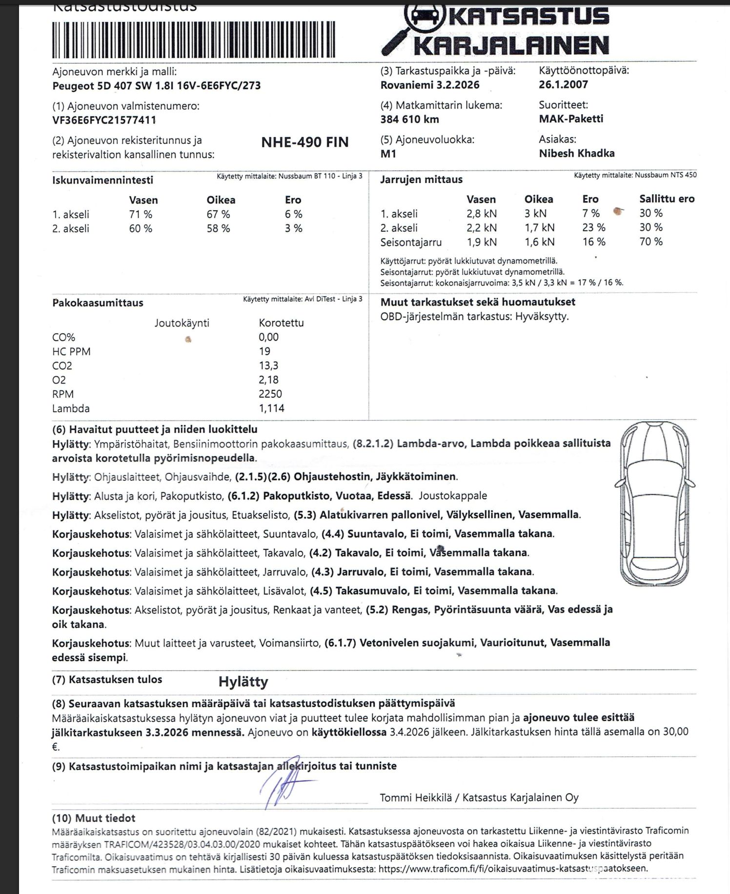 Katsastustilanne: Hylätty määräaikaiskatsastuksessa 3.2.2026.