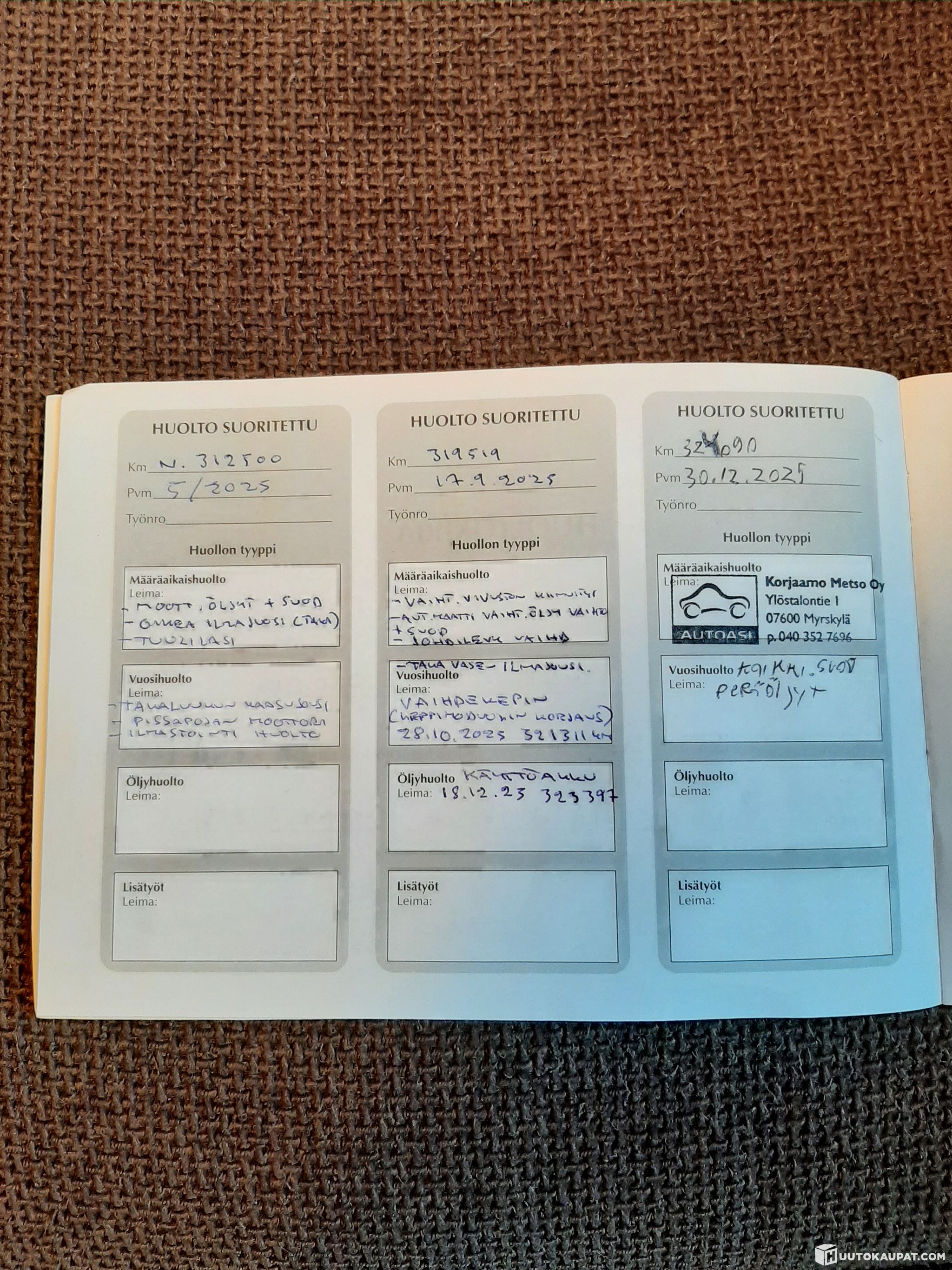 Kaikki suodattimet, peräöljyt, käyttöakku, vaihdekepin keppimoduulin korjaus, vaihteiston vivuston korjaus, vaihteiston öljyn vaihto+ suodatin, johdonlevy vaihdettu, vasen taka ilmajousi.