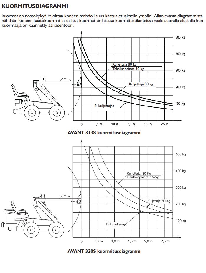 Kuvissa kuormaajan tekniset tiedot sekä nostodiagrammi.