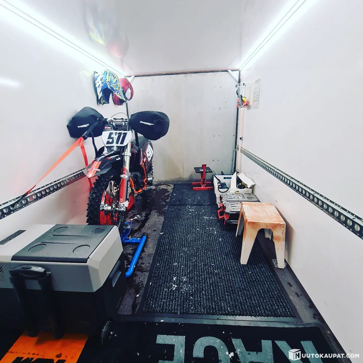 Lattialle toiseen reunaan asennettu (kuvista poiketen) arviolta noin 50cm*200cm kokoinen alumiinikaukalo, jonka tarkoitus on ollut toimia ns. rapakaukalona pyörän alla. Kätevä pitää puhtaana ja lika tippuu kaukaloon eikä kärryn pinnalle. Irroitettavissa.